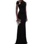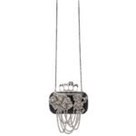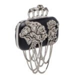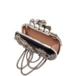 Introducing the Alexander McQueen Women’s Knuckle Clutch in Black, featuring exquisite floral Crystal Chain embroidery and a handle adorned with dazzling crystal-encrusted rings. This versatile clutch can be effortlessly worn either hand-held or over the shoulder using its chic chain strap.