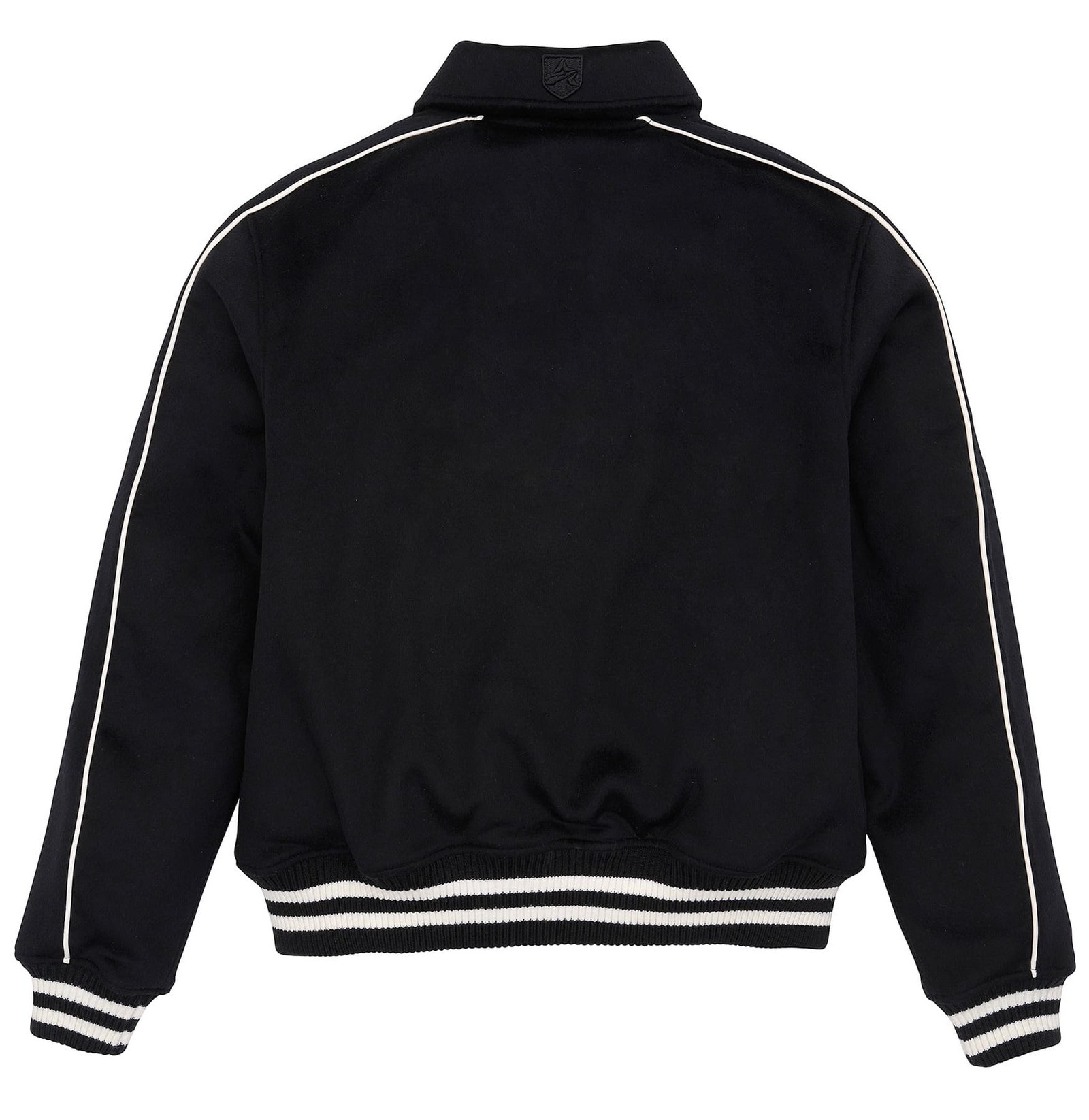 - Striped rib knit collar and waistband and cuffs