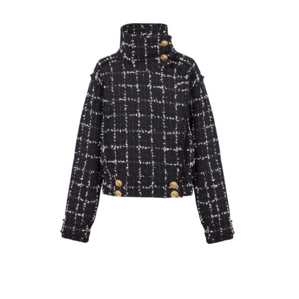 Detailing is where the Balmain Tweed Bomber Jacket truly shines. Embellished with the brand’s signature gold-tone hardware, including embossed buttons and zipper pulls, the jacket exudes an air of luxury and sophistication. Intricate stitching accents the seams, highlighting the expert craftsmanship that goes into every aspect of its construction.