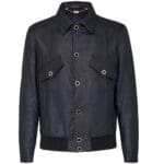 The python-skin jacket boasts a striking shiny-effect treatment, embodying uniqueness and extravagance. It features a stylish shirt collar and is adorned with the brand’s coat-of-arms in a metallic rendition on a hanging loop at the yoke.