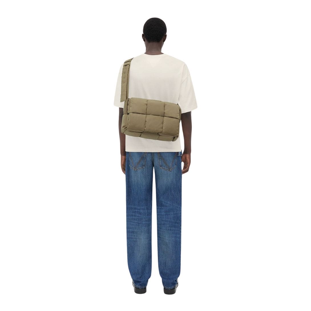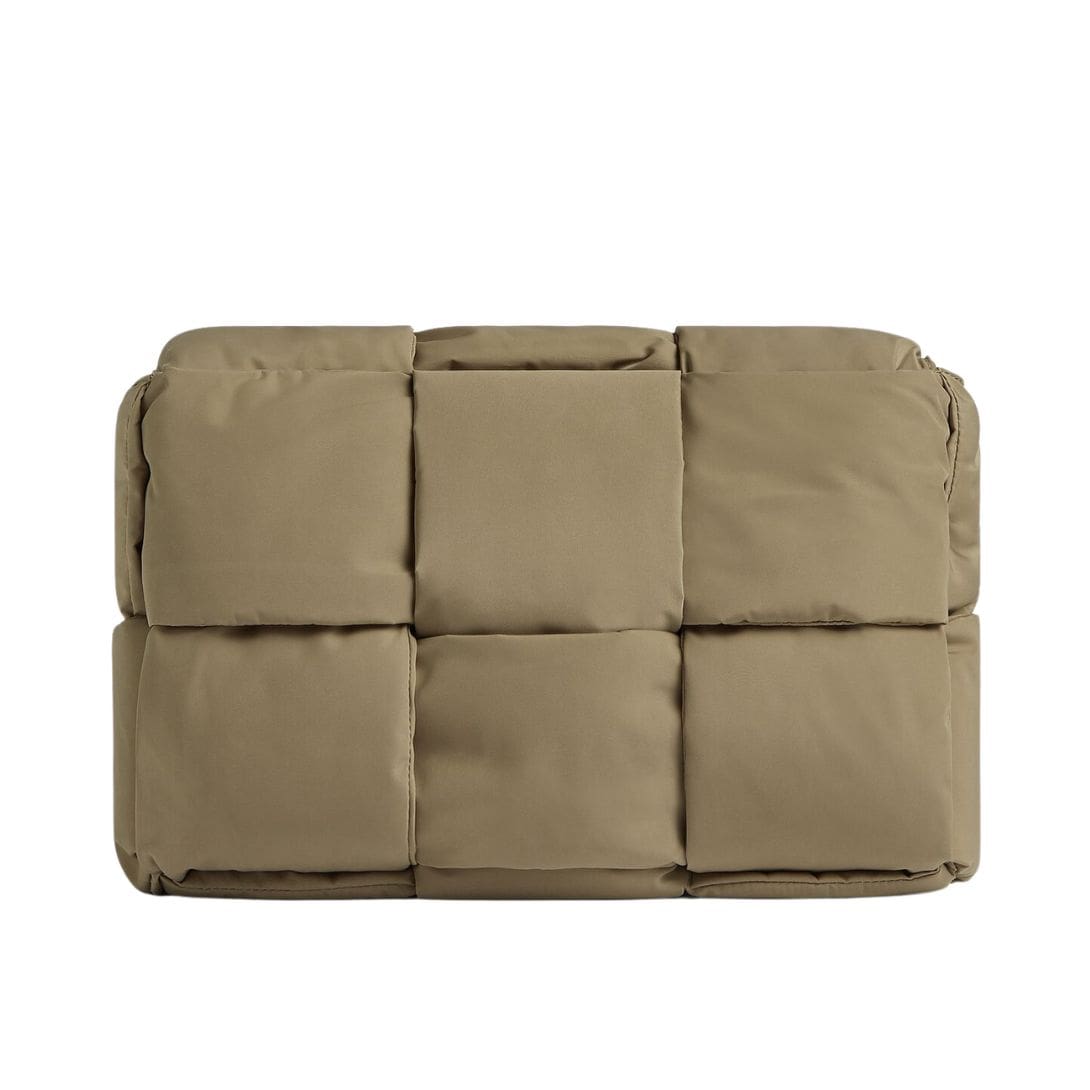 The design of the Pillow Cassette is characterized by clean lines and geometric precision, exuding a sense of modernity while maintaining a timeless allure. Its silhouette is structured yet inviting, offering a plush surface for relaxation and lounging. The distinctive quilted pattern, reminiscent of the brand’s iconic Intrecciato weave, adds a layer of visual interest and depth, creating a captivating interplay of light and shadow.