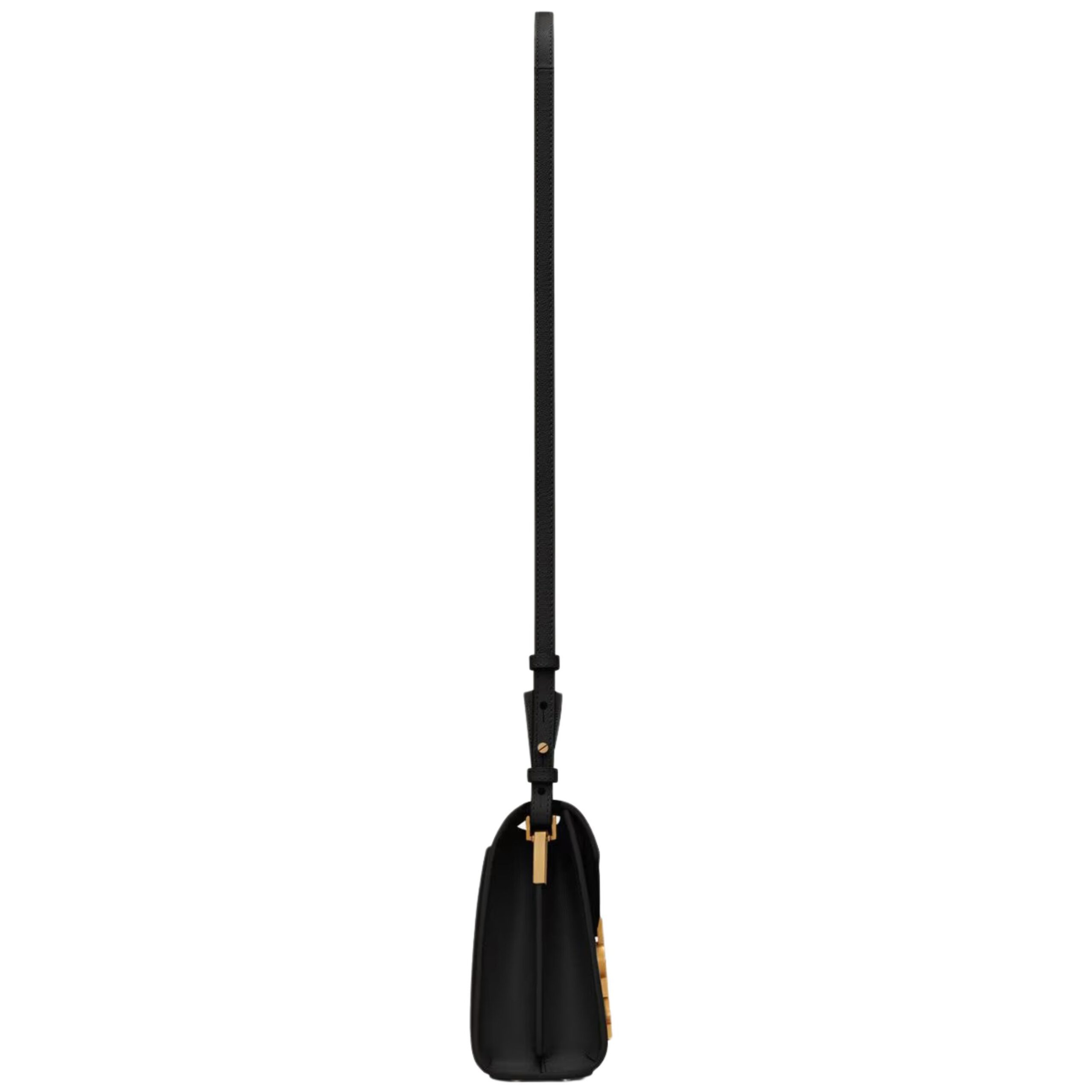Designed with a structured silhouette, the bag features a sleek top handle and a detachable shoulder strap, allowing for versatile styling — from a polished hand-carry to an effortless crossbody look. The standout feature is the iconic gold-toned YSL monogram, which functions as a pivoting closure, adding a signature touch of bold sophistication.