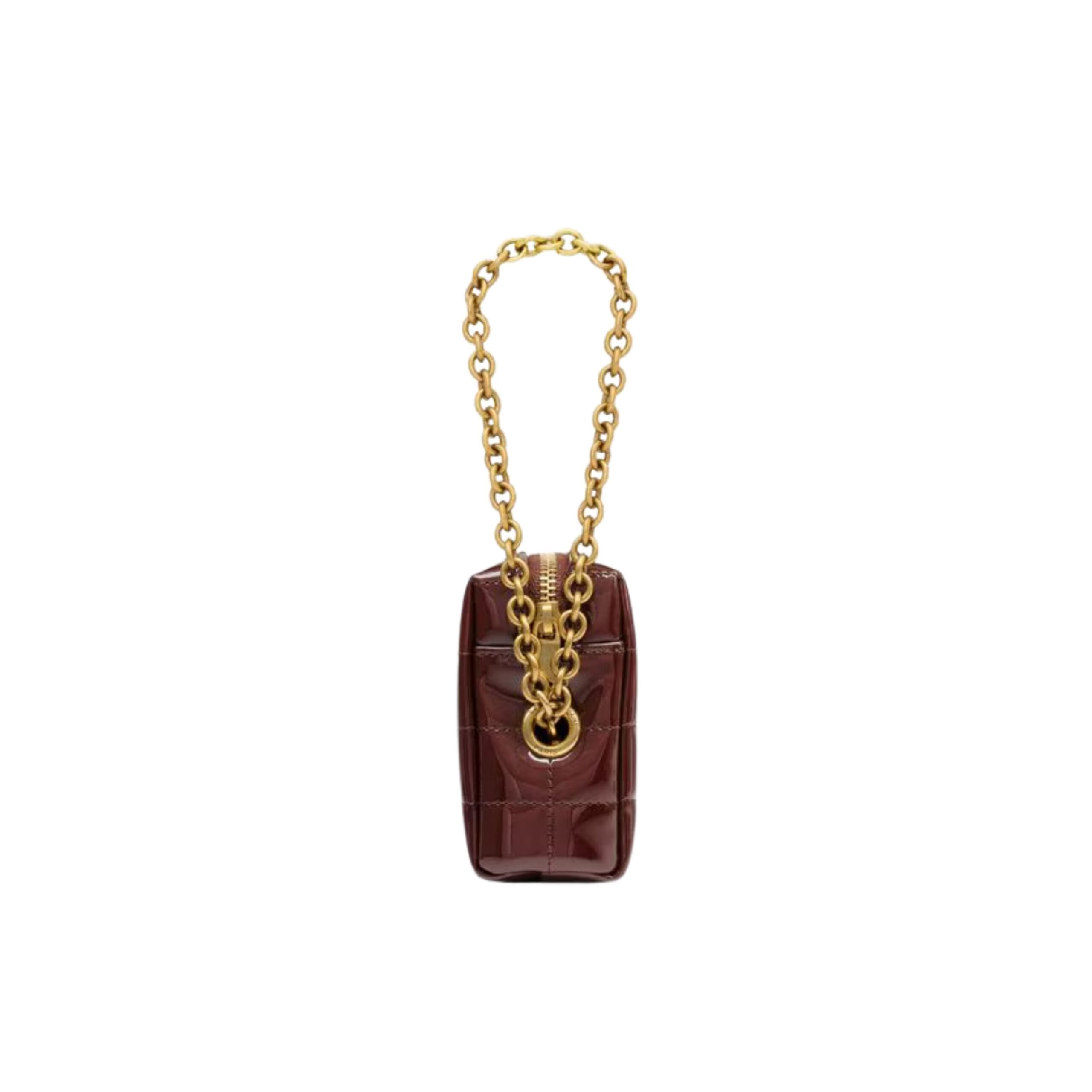 Cassandre Matelassé Carré Pouch on Chain in Shiny Canvas is a refined, compact accessory from Saint Laurent that effortlessly combines elegance with practicality. This iconic pouch is distinguished by its structured carré (square) shape, crafted in high-shine canvas that mimics the luxurious look of patent leather while offering a modern, durable finish.