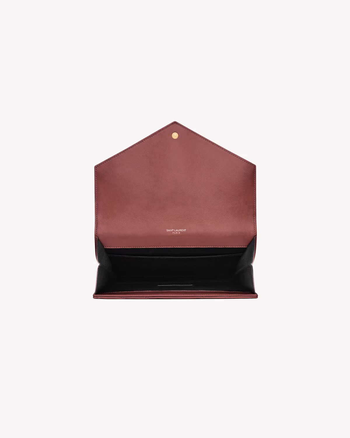This elegant accessory features the signature Cassandre YSL monogram in antique gold-tone hardware, prominently placed on the front flap—instantly recognizable and symbolizing understated glamour. The pouch closes securely with a magnetic snap closure, maintaining a slim profile while offering practical utility. Inside, the minimalist interior is lined with grosgrain and includes a single flat pocket, making it ideal for carrying essentials like cards, keys, or a compact phone.