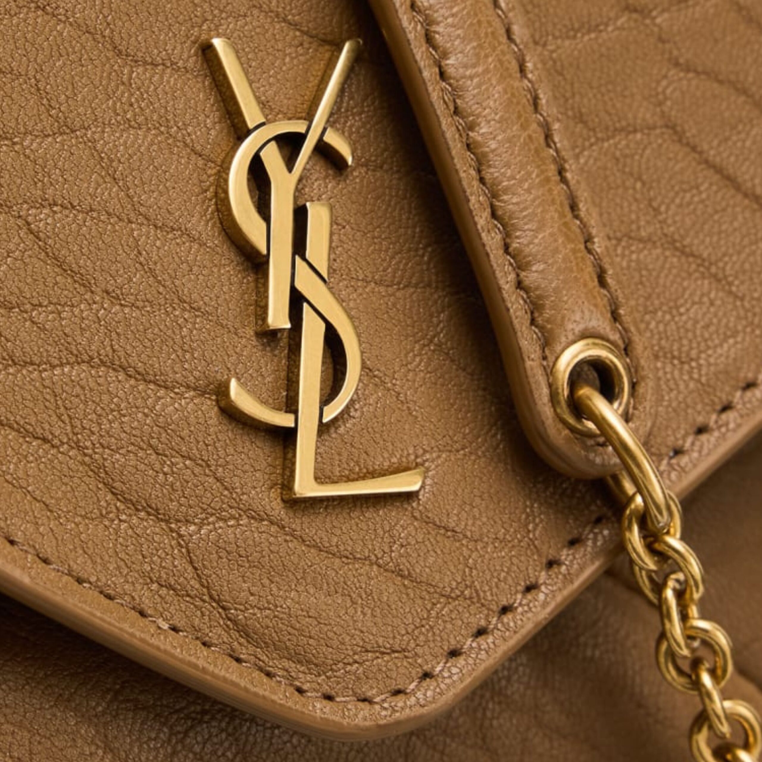 The front flap is adorned with the iconic interlocking YSL logo in stunning gold-tone or black hardware, depending on the variation. This instantly recognizable emblem adds a touch of glamour and brand prestige. The leather is supple yet durable, offering both comfort and longevity, making it ideal for daily wear or special occasions.