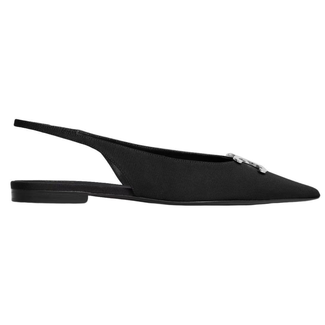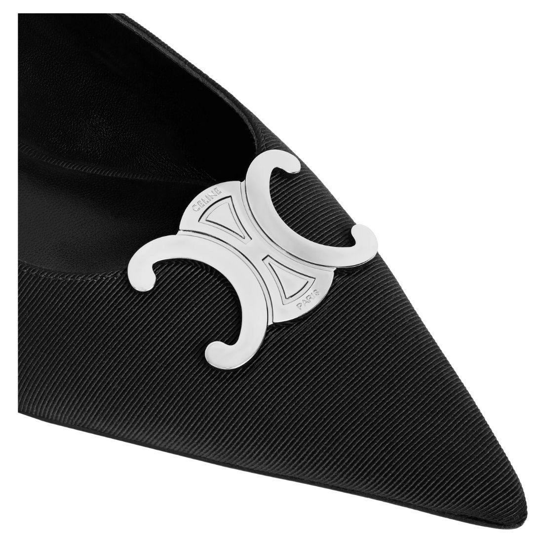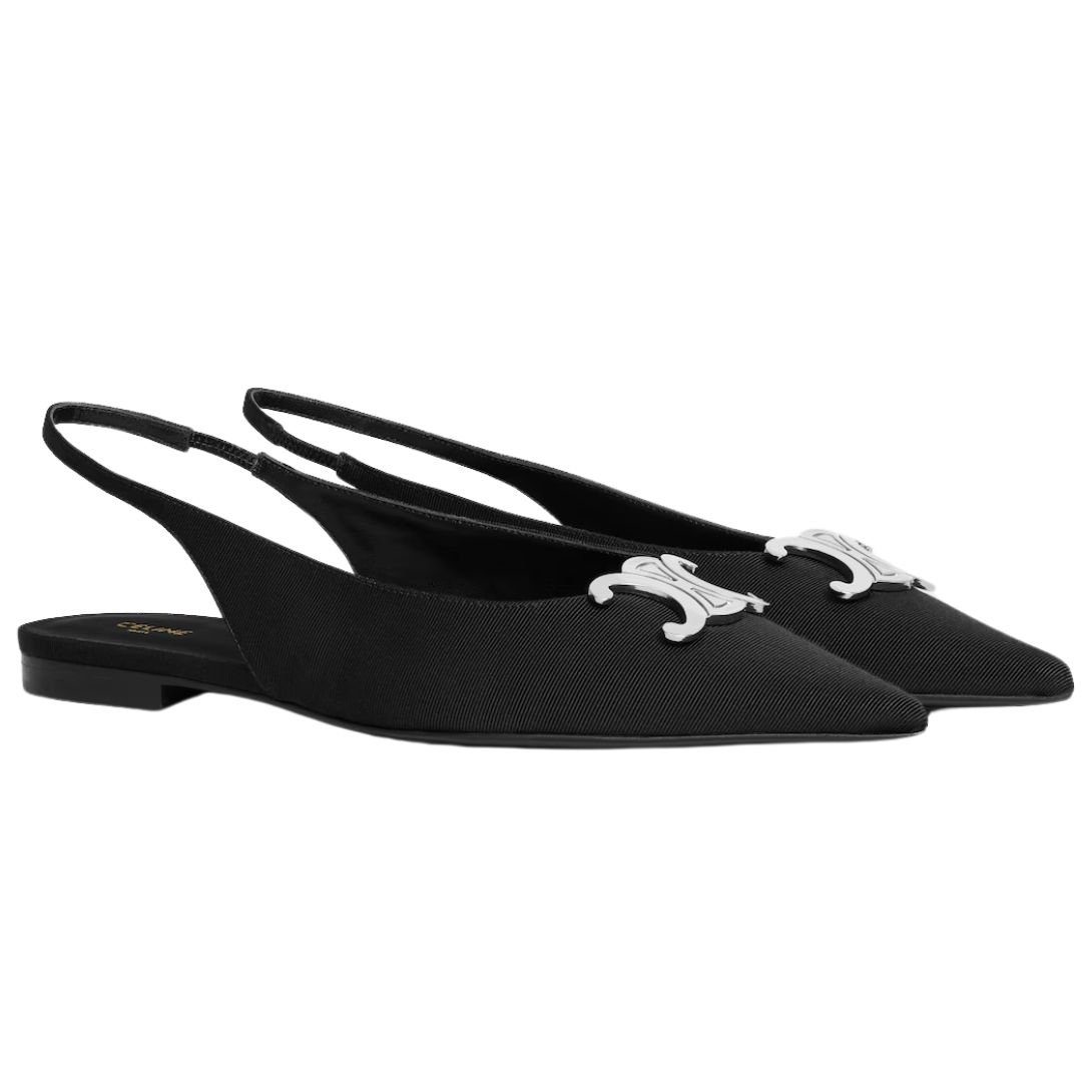 Expertly crafted from 57% cotton and 43% viscose, these Celine Alma Triomphe Flat Slingback in Gros Grain offer a sophisticated balance of comfort and durability. The pointy toe shape adds a sleek, elongating effect, enhancing their timeless appeal. A large metal Triomphe emblem on the toe serves as the focal point, exuding elegance and brand heritage.