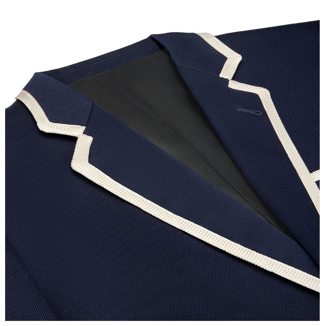 Braided piping details enhance the sophisticated aesthetic, while a middle back vent ensures ease of movement. The blazer is finished with Celine Blason buttons, featuring two on the front and four on the cuffs, adding a distinctive signature touch.