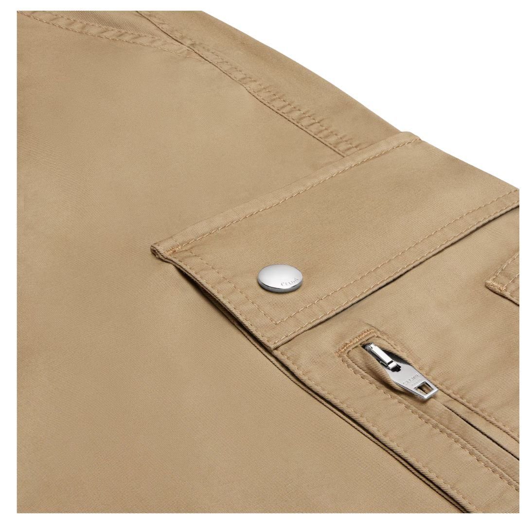 With two side pockets and two flap pockets on the back, these pants provide ample storage for essentials. The right leg features a patch pocket with a flap and CELINE snap buttons, while the left leg includes a patch pocket with a flap, CELINE snap buttons, and a CELINE zip, adding both practicality and a refined touch.