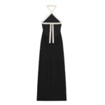 The neckline features contrasting cross-back bands, enhancing the structured yet flowing silhouette. The open back with contrasting bands and bow adds a refined yet bold statement.