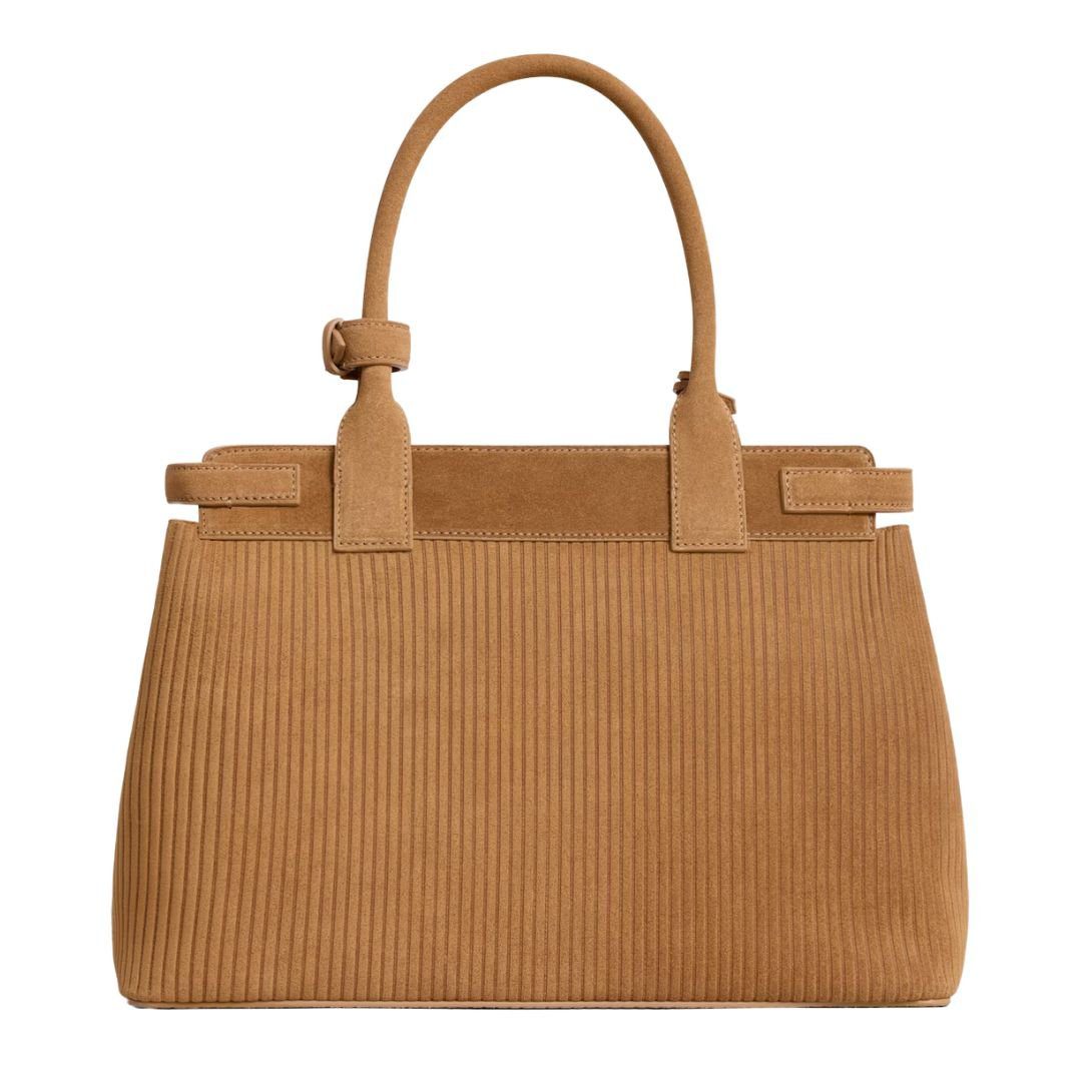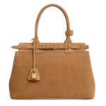 Crafted from luxurious suede calfskin, this 13 x 10 x 6-inch (34 x 26 x 15 cm) handbag offers a refined blend of elegance and functionality. The gold finishing adds a sophisticated touch, making it a timeless accessory for any occasion.