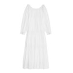 The hem is adorned with Triomphe broderie anglaise, adding delicate texture and intricate detailing. Triomphe embroidered fish scale trims enhance the low-cut crew neck, pleated plastron, ruffles, shoulders, and cuffs, elevating the design with sophisticated craftsmanship.