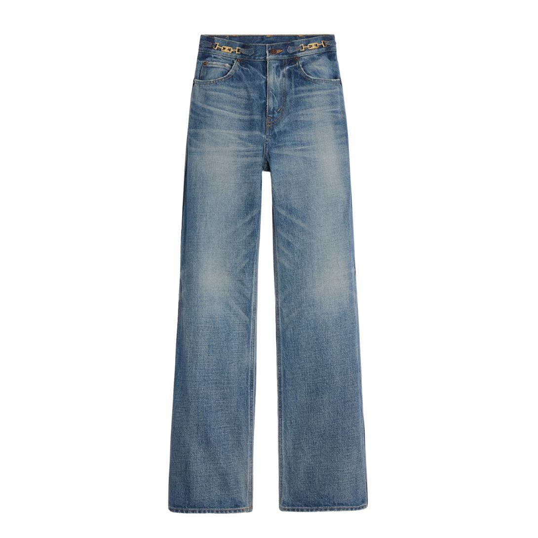 A blend of sophistication and practicality, these jeans feature a five-pocket construction, reinforced with rivets on the front pockets for added durability. The Triomphe gourmette chains at the waist elevate the design with a distinctive, luxurious touch.