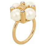 This exquisite Celine Les Perles Ring in Strass Resin Pearls and Brass with Gold Finish combines high-quality materials with a refined design, making it a perfect addition to any jewelry collection.
