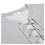 The V-neck collar is accented with laces, adding a vintage-inspired detail that sets this piece apart while allowing for an adjustable fit.