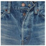 A five-pocket design ensures practicality, while rivets on the front pockets reinforce durability and classic denim styling.