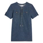 This mini-length dress features two patch pockets on the chest, each adorned with Triomphe buttons, adding a signature touch of luxury. The two side pockets provide additional practicality. The V-neckline with laces offers an effortlessly chic and adjustable look, adding a hint of bohemian flair.