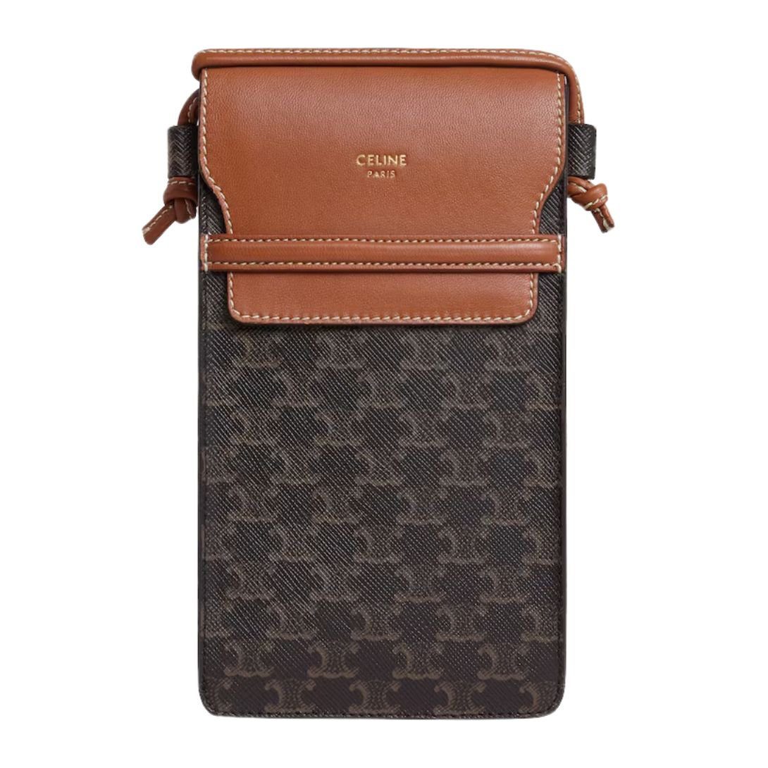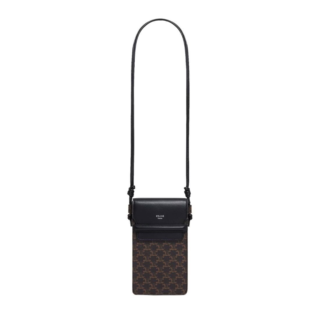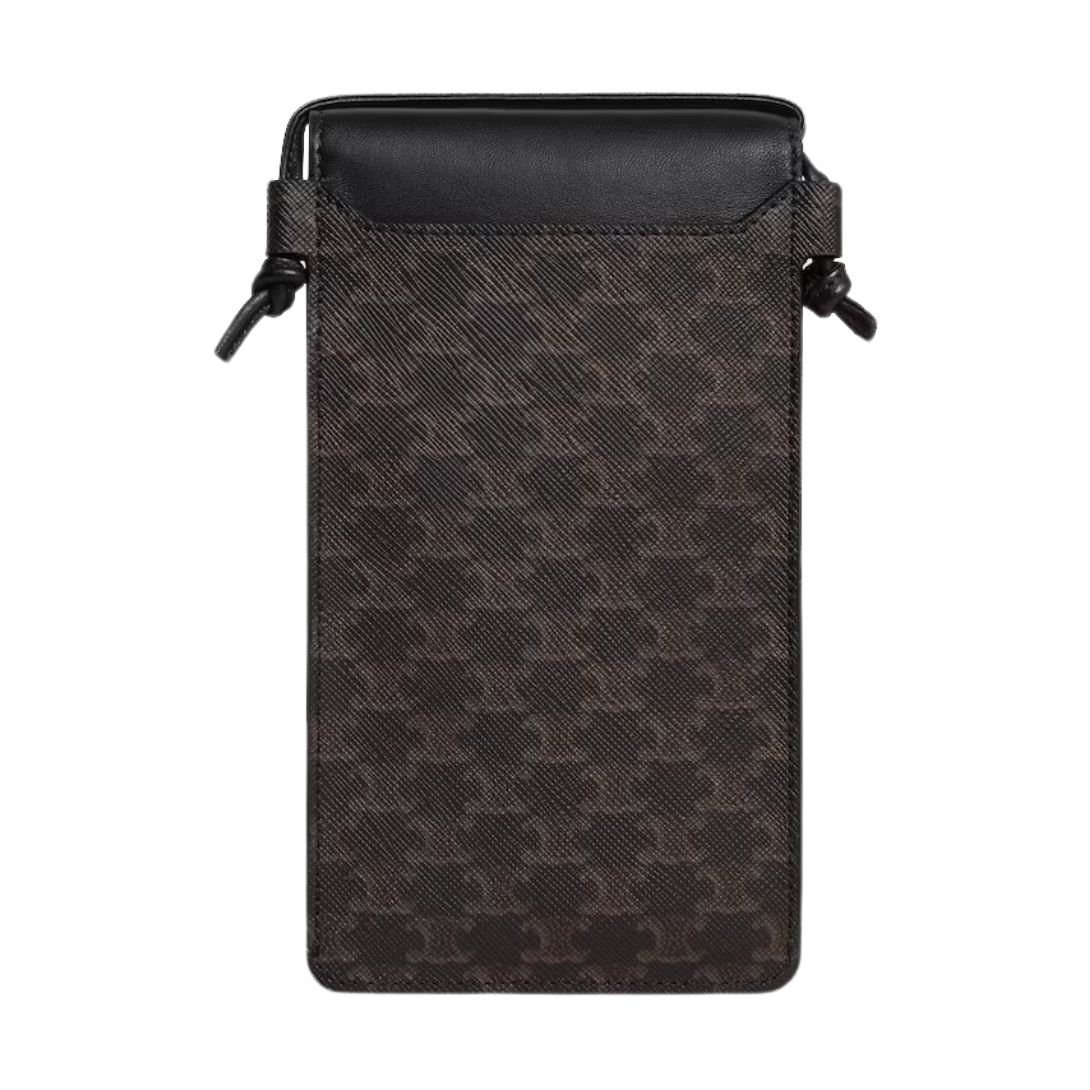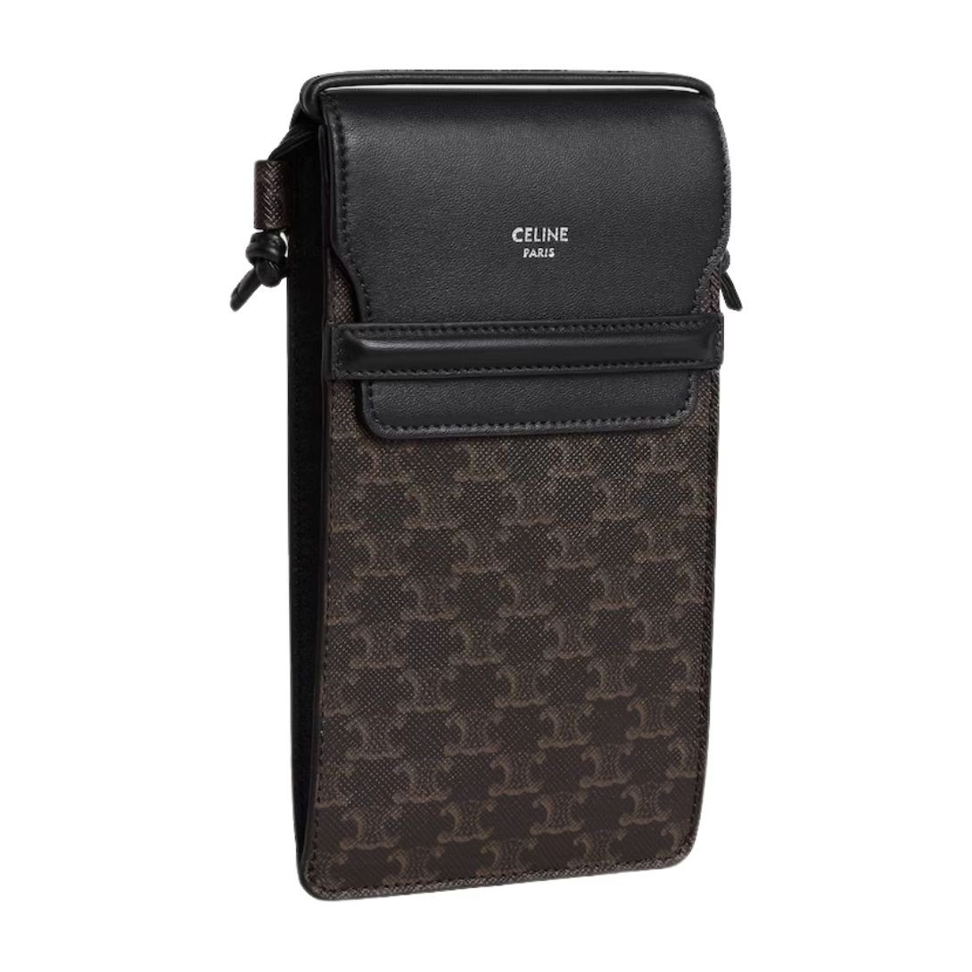 CELINE PHONE POUCH WITH FLAP IN TRIOMPHE CANVAS AND LAMBSKIN BLACK