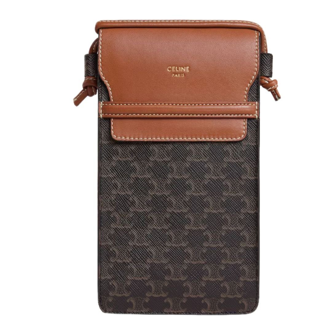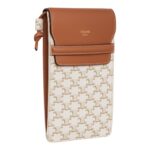This sleek Celine Phone Pouch with Flap in Triomphe Canvas and Lambskin White-Tan is crafted from Triomphe Canvas with lambskin trimmings and a calfskin lining, offering a perfect blend of durability and elegance. The gold finishing adds a refined touch, making it an exquisite accessory for everyday wear.