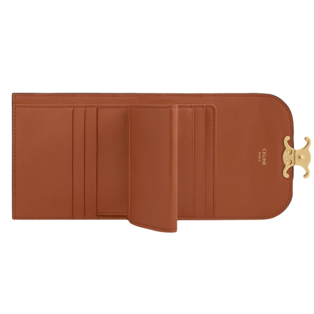 Adorned with gold finishing, this wallet radiates sophistication. The Triomphe metallic snap button closure adds a distinctive touch, securing your essentials with elegance.