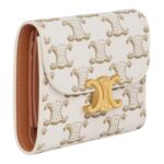Crafted from Triomphe Canvas, this Celine Small Flap Wallet Triomphe in Triomphe Canvas White-Tan combines classic elegance with durability. The calfskin lining adds a luxurious touch, ensuring a refined feel and long-lasting quality.
