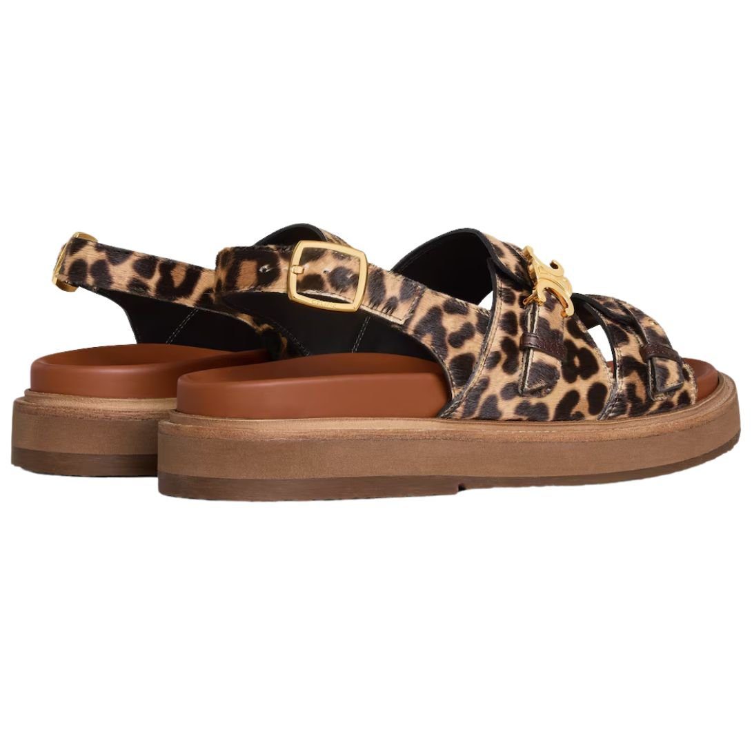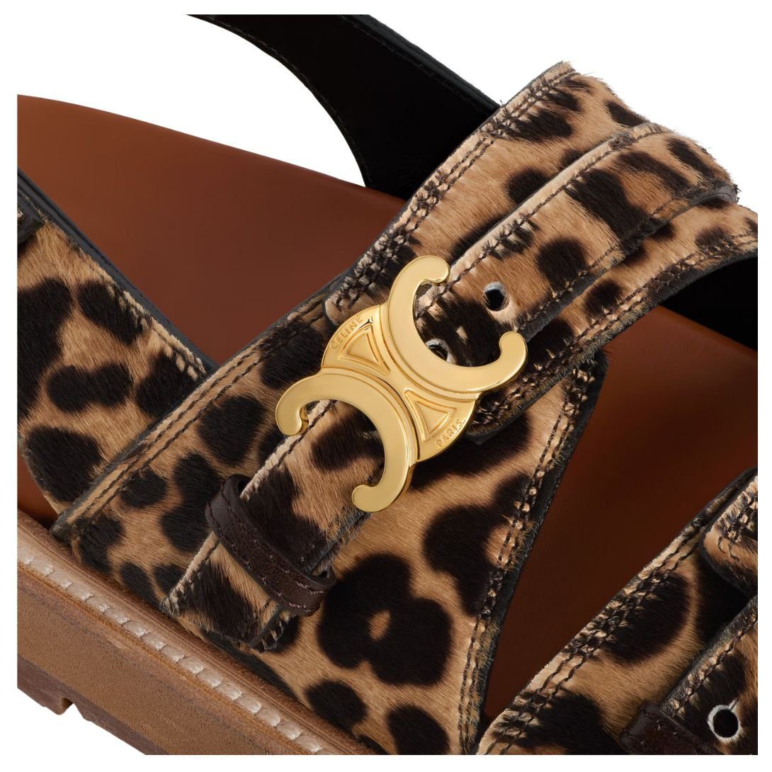 Crafted from 100% calfskin, these Celine Tippi Triomphe Sandal in Leopard Printed Hairy Calfskin offer a smooth and durable finish, ensuring long-lasting wear. The 100% goatskin lining provides a soft and supple feel for enhanced comfort.