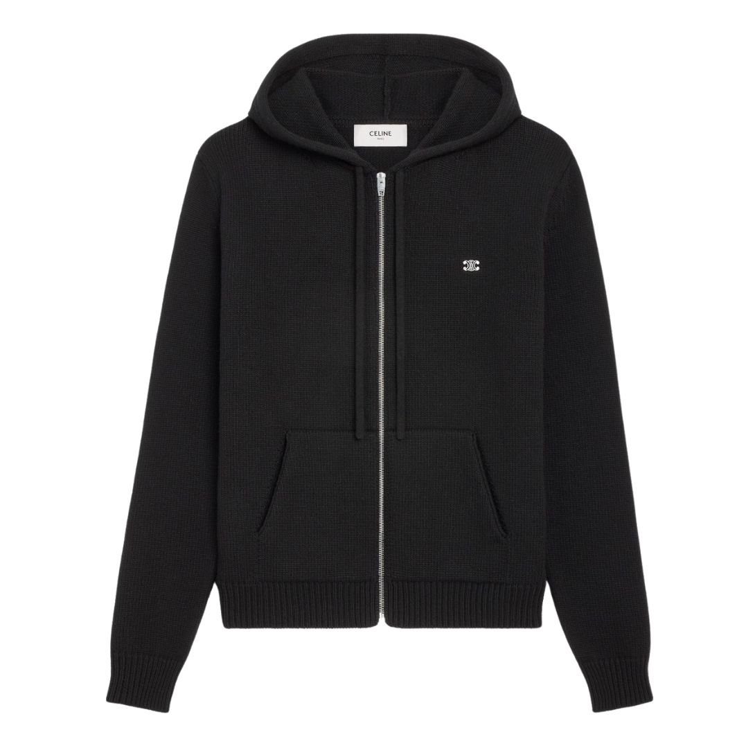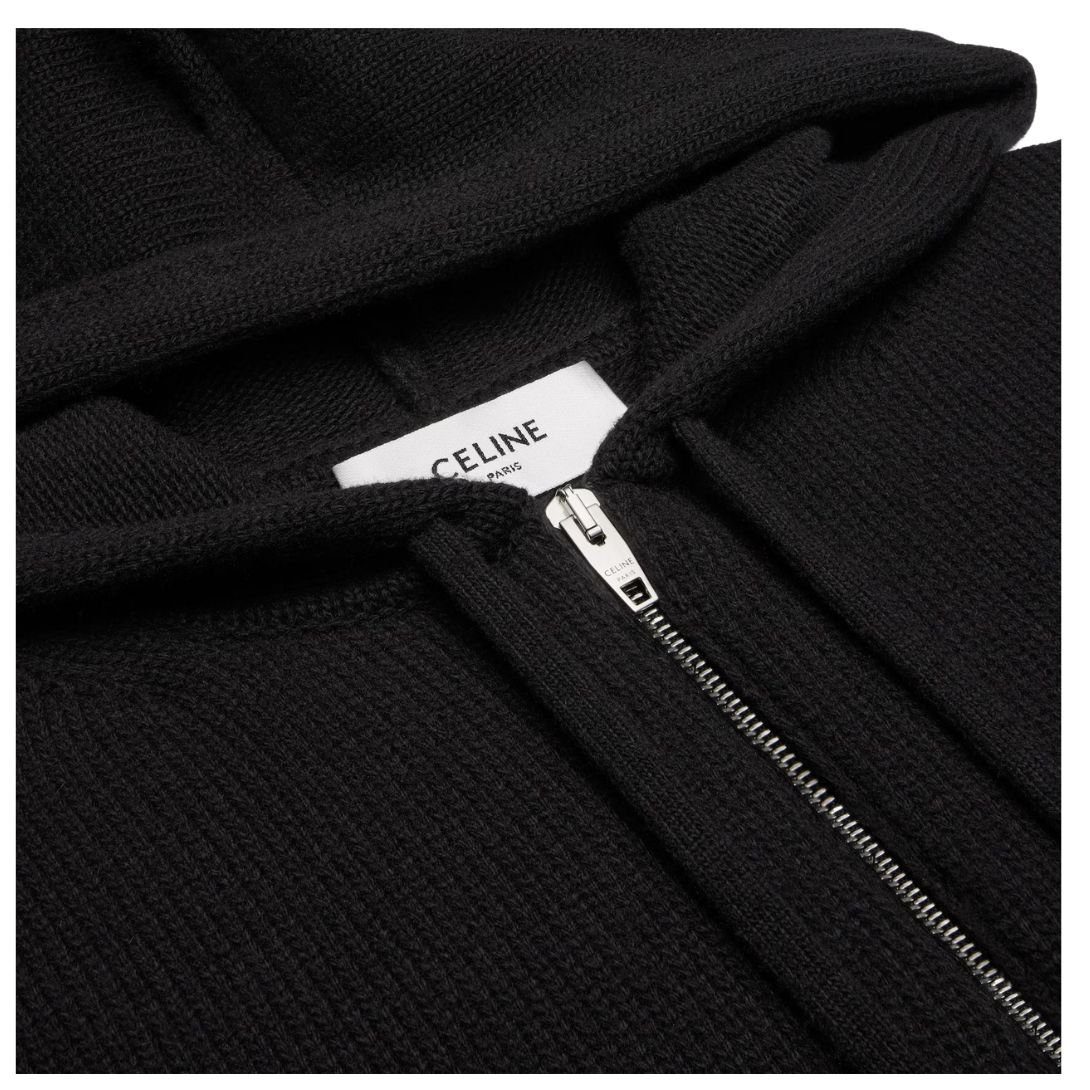 The adjustable hood offers customizable coverage, while the Celine Paris-engraved metal aglets add a signature luxury detail.