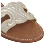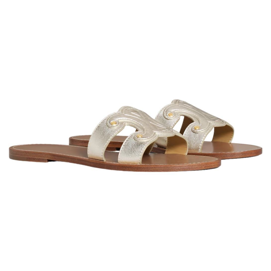 Made from 100% premium calfskin, these Celine Triomphe Mule in Metalized Calfskin offer a refined and durable exterior, complemented by a full calfskin lining for enhanced comfort and longevity. The fine leather construction ensures a polished, sophisticated finish.
