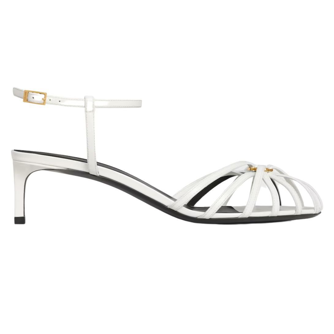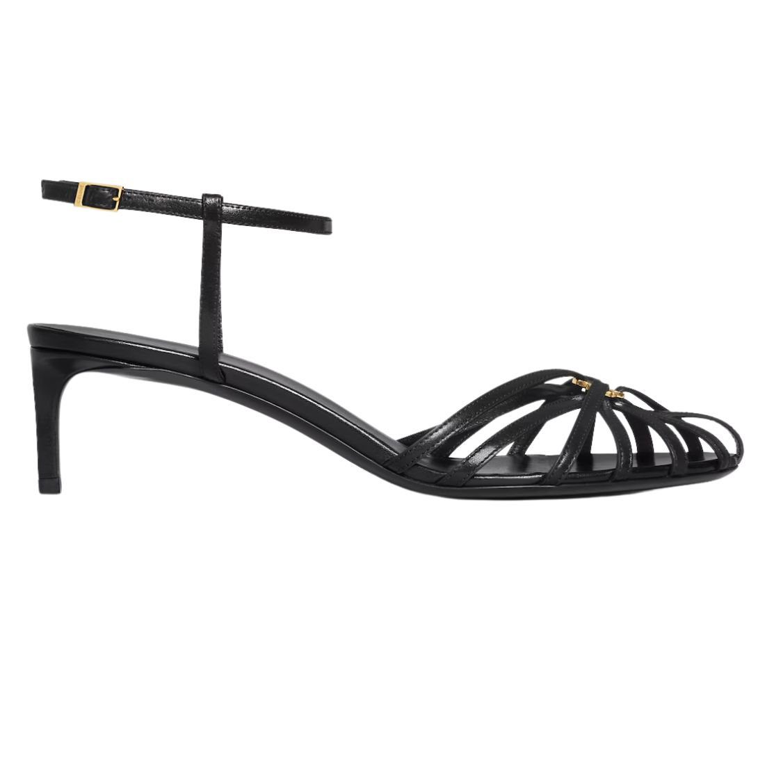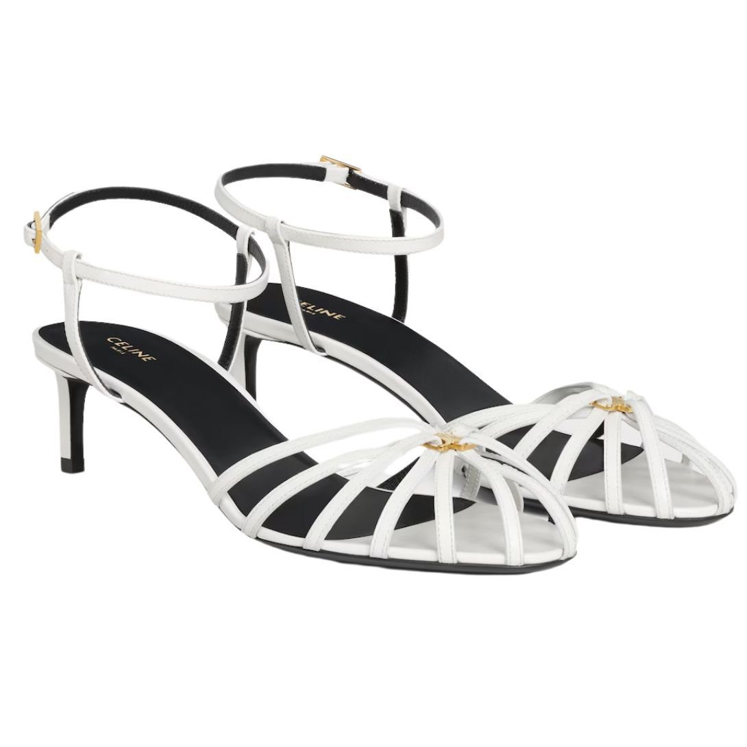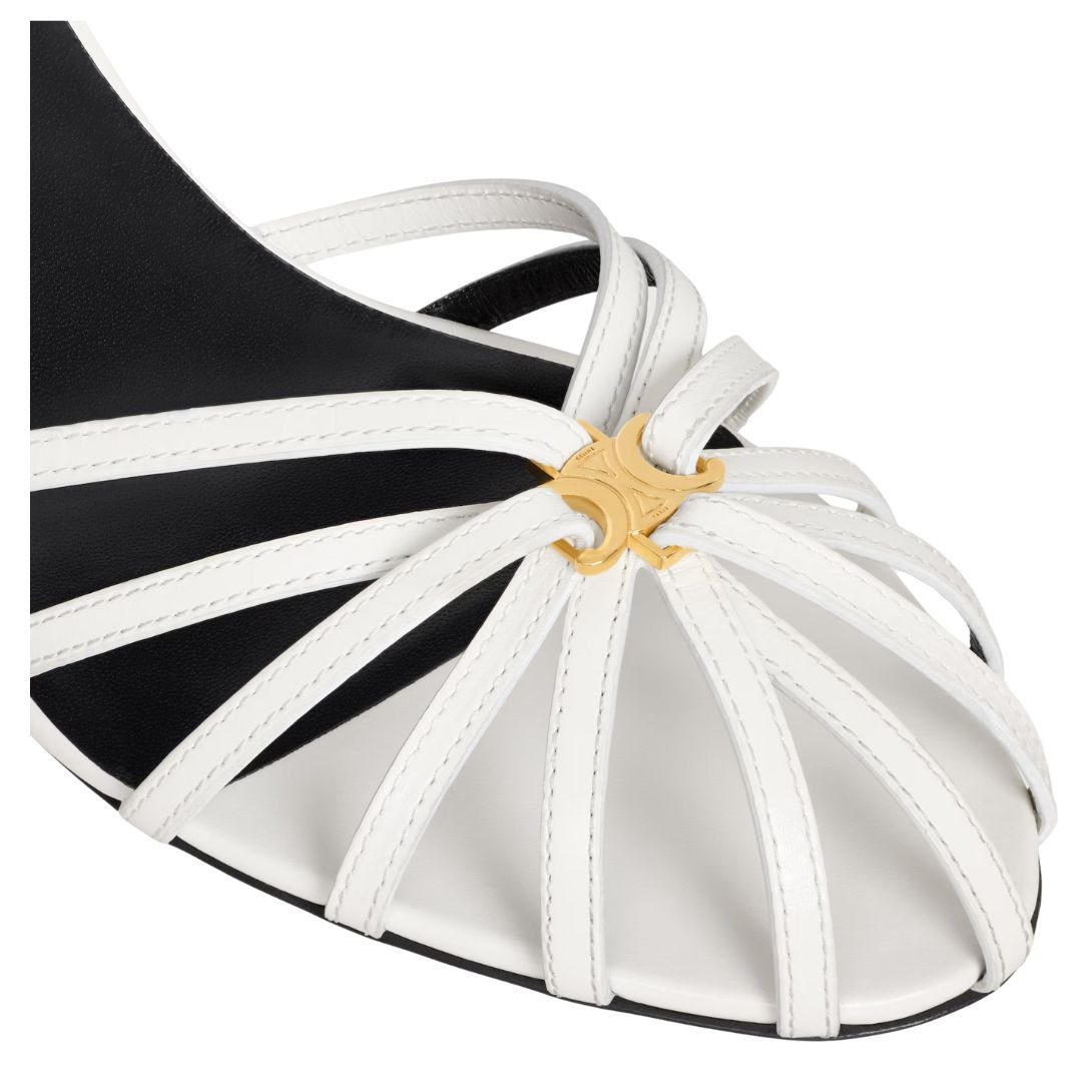 Featuring an almond toe shape, these heels provide a timeless silhouette. The thin leather straps and cage-effect toe design create a delicate yet structured look, adding a bold and modern touch. A metal Triomphe emblem at the center of the straps enhances the design with CELINE’s signature sophistication.