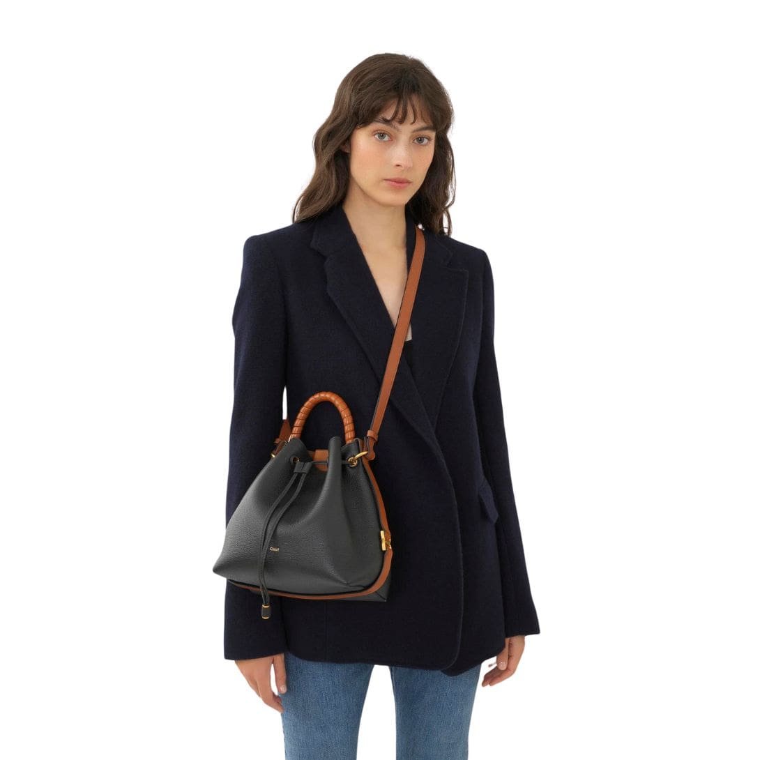 Introducing a contemporary twist to the iconic Marcie line, the Maison unveils its latest addition: the CHLOE Marcie Bucket Bag Black. Crafted from Chloé’s renowned soft, grained calfskin, this modern-day companion epitomizes the brand’s commitment to quality and sophistication. With its spacious main compartment secured by a leather drawstring closure, this bucket bag offers both style and practicality for the modern woman on the go.