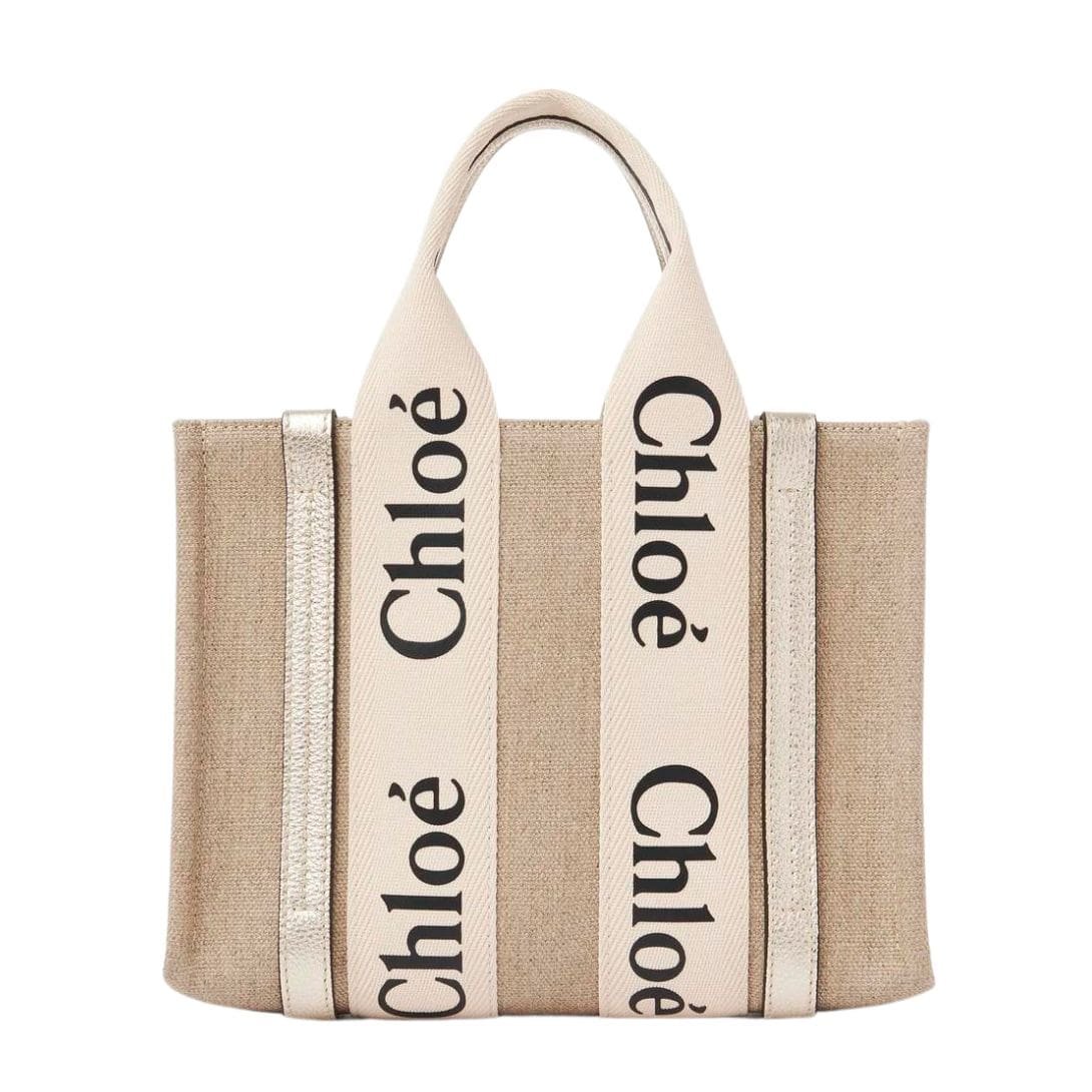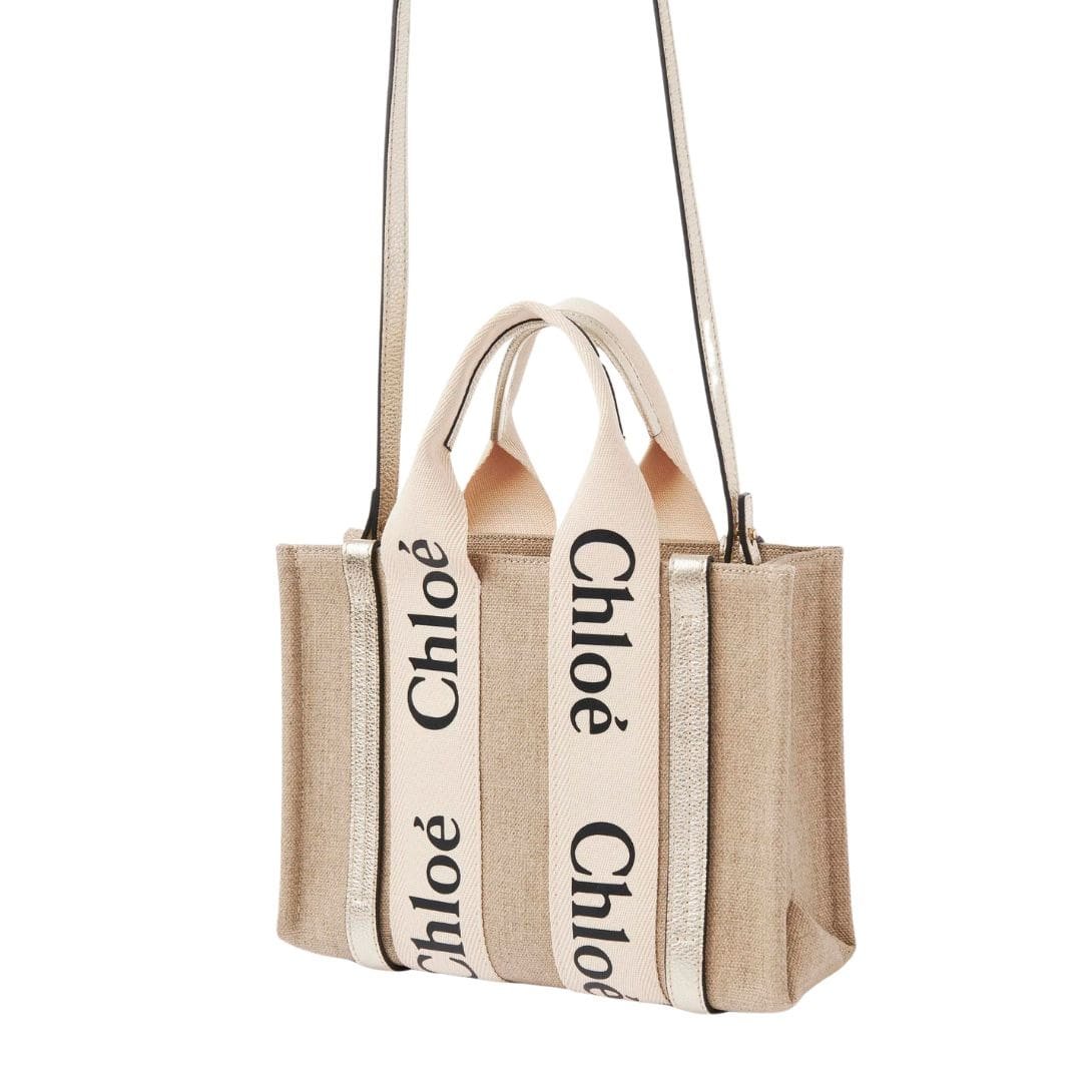 Indulge in the epitome of contemporary elegance with the CHLOE Small Woody Tote Bag With Strap Light Gold, a versatile and stylish accessory crafted from linen detailed with metallic calfskin for an exquisite contrast. With its sharp, modern lines and signature Chloé logo ribbon, this miniature marvel seamlessly marries functionality with fashion-forward flair, making it the perfect companion for both day and evening endeavors.