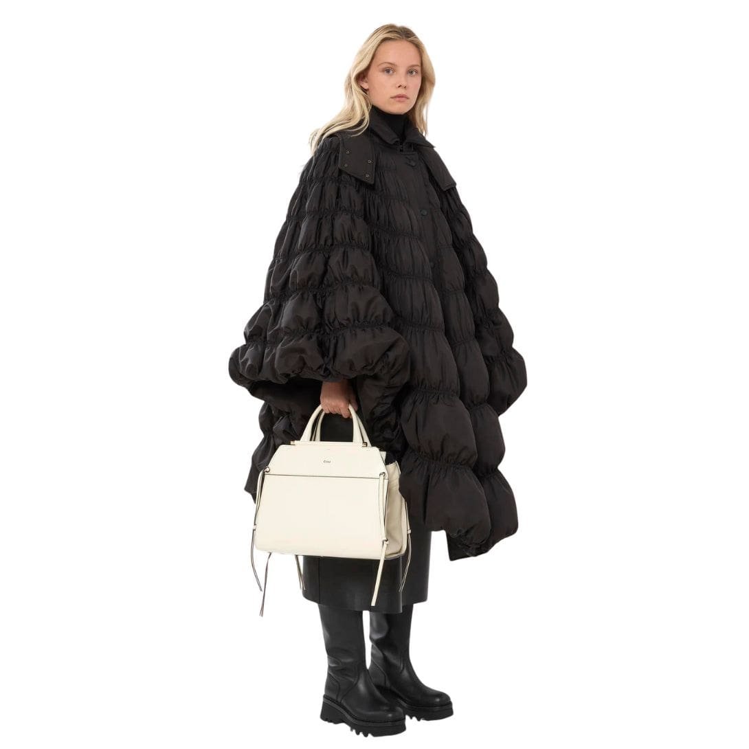 At the heart of this statement piece lies a dedication to elevated leather craftsmanship, where the marriage of premium materials and meticulous design results in a harmonious fusion of form and function. The signature leather-covered engraved metallic piece adorning the handle is a testament to Chloé’s attention to detail, infusing the bag with an air of understated opulence.