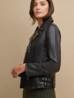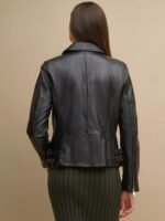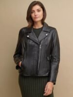 Asymmetrical zip front with fold down collar.