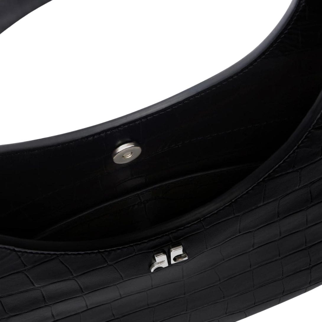 Emphasizing its luxury status, the bag is adorned with Courrèges’ iconic logo discreetly embossed or engraved, signifying craftsmanship and heritage. The hardware, whether in polished gold or silver tones, adds a touch of opulence while ensuring durability and longevity. COURREGES HOLY CROCO STAMPED BAG