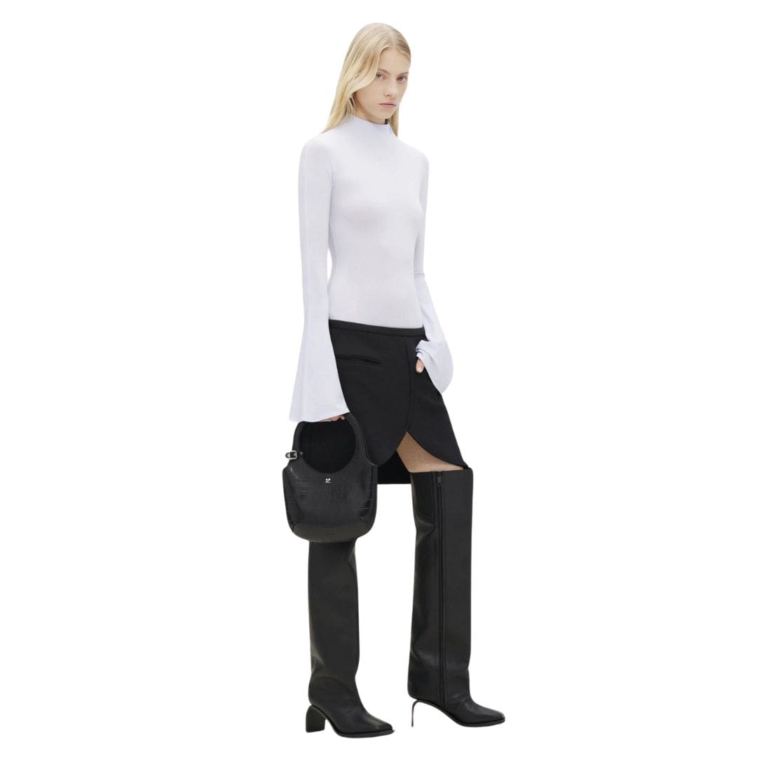 At first glance, the Holy Croco Stamped Bag captivates with its clean lines and structured silhouette, characteristic of Courrèges’ minimalist design philosophy. The leather’s tactile quality enhances the bag’s tactile appeal, inviting touch and admiration. Available in a range of classic and vibrant hues, each shade complements the bag’s modern, yet versatile, design, making it suitable for both casual outings and formal events.