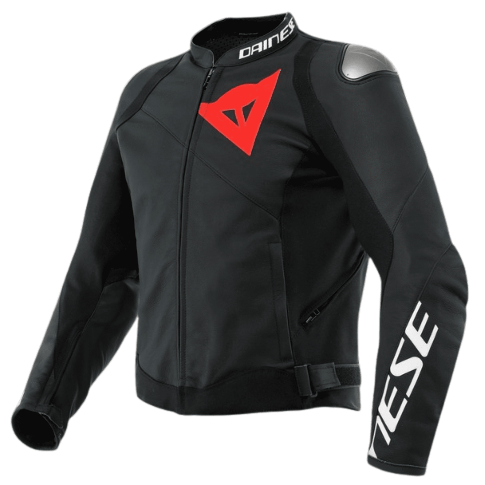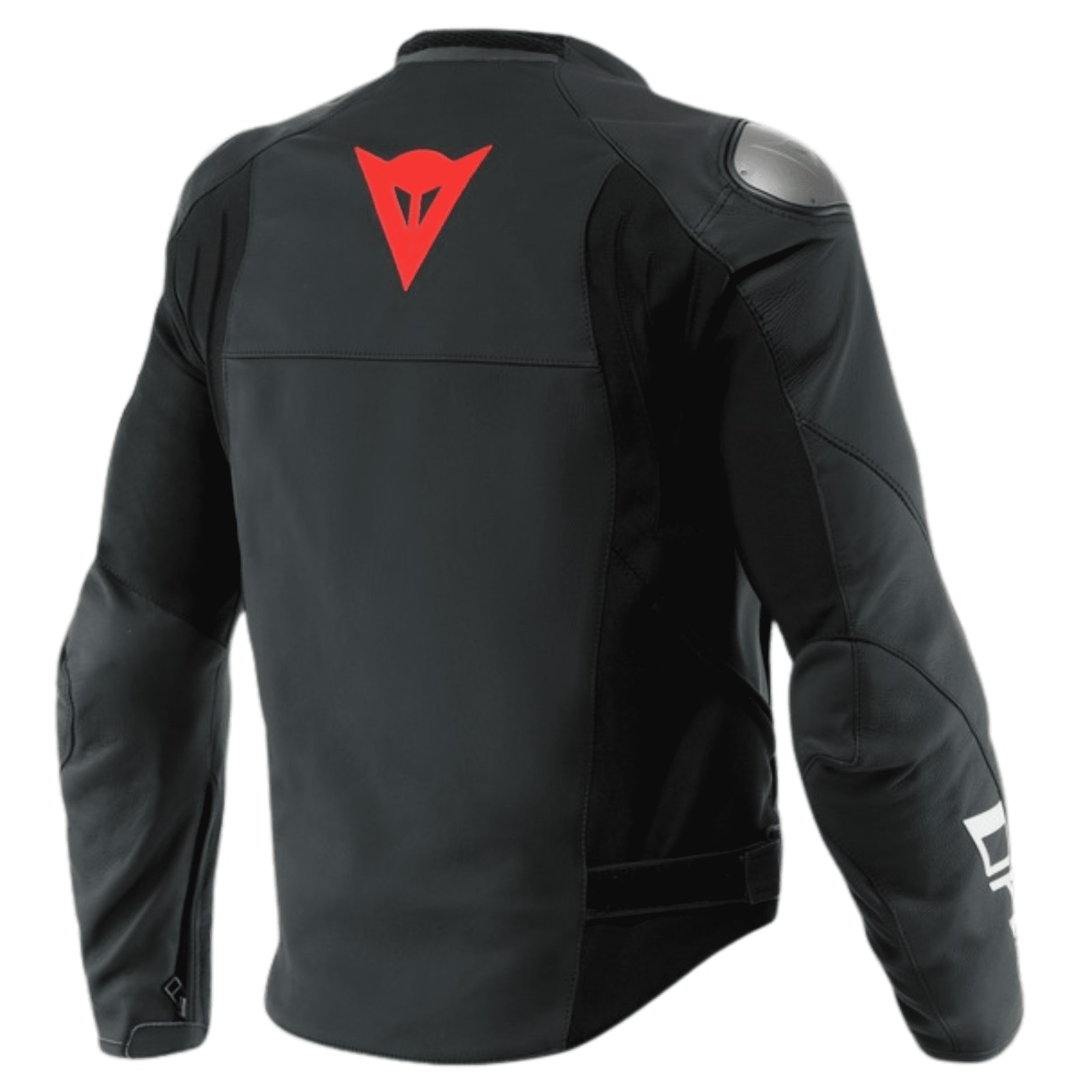 Dainese Sportiva Leather jacket Black, made of soft and resistant Tutu cowhide, with EN 1621.1-certified Pro-Armor internal protectors, which simultaneously guarantee maximum protection, flexibility, and freedom of movement owing to ventilation over 40% of their surface area. The internal shoulder protectors are paired with interchangeable aluminum plates on the outside: a distinctive Dainese technology that is designed to facilitate sliding in the event of a fall and avoid the risk of rolling on asphalt.
