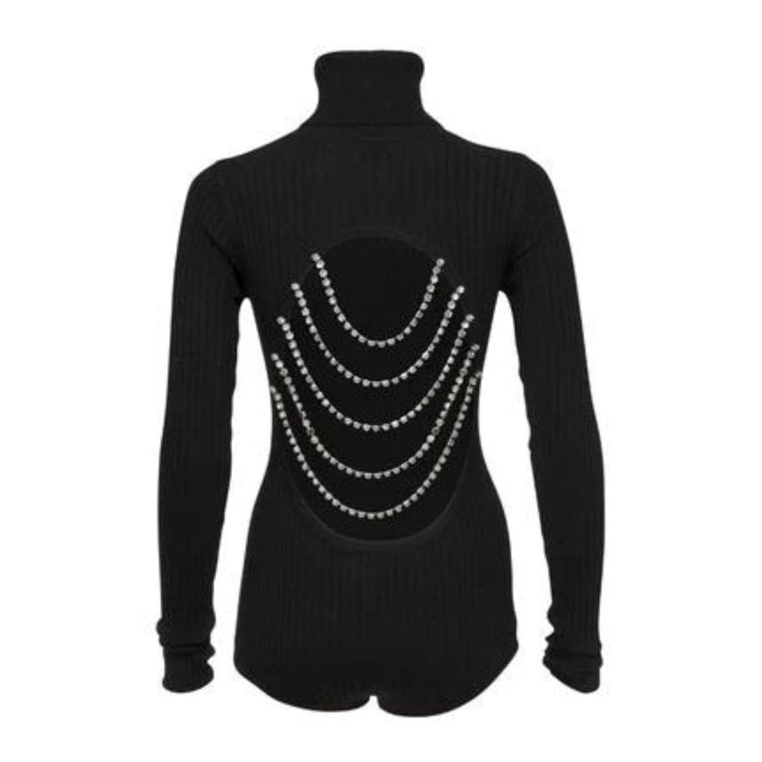 The dodo bar or Lewis Bodysuit is crafted from ribbed knit and features long sleeves, a high neck, and a circle cut-out back embellished with crystal chains.