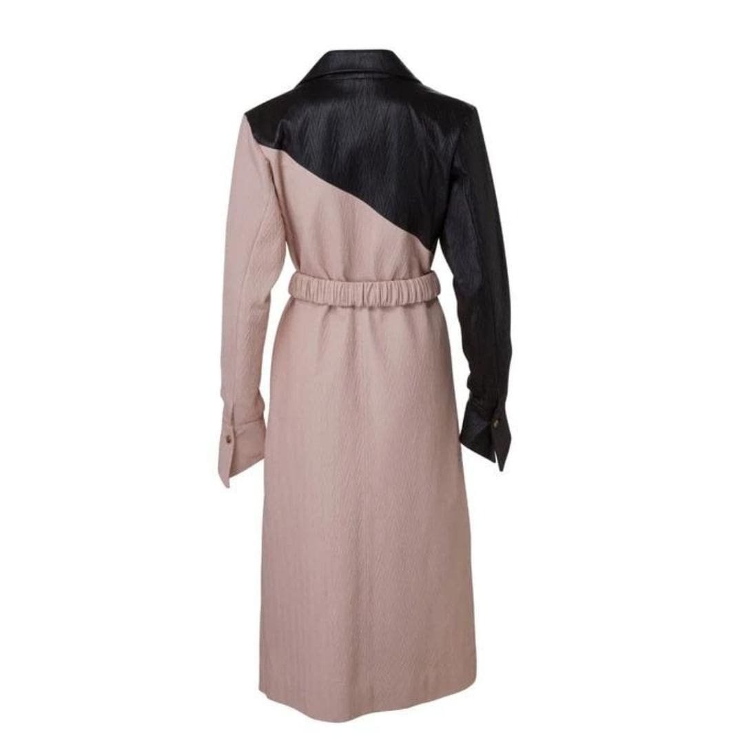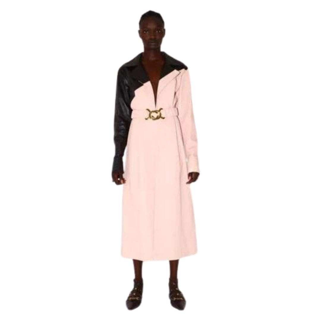 The Dodo Bar OR Mia dress is crafted from pleated leather and features a biker collar, wide notch lapels, and a V-neckline. It includes button cuffs and a ruched belt that cinches at the waist for a contoured effect.