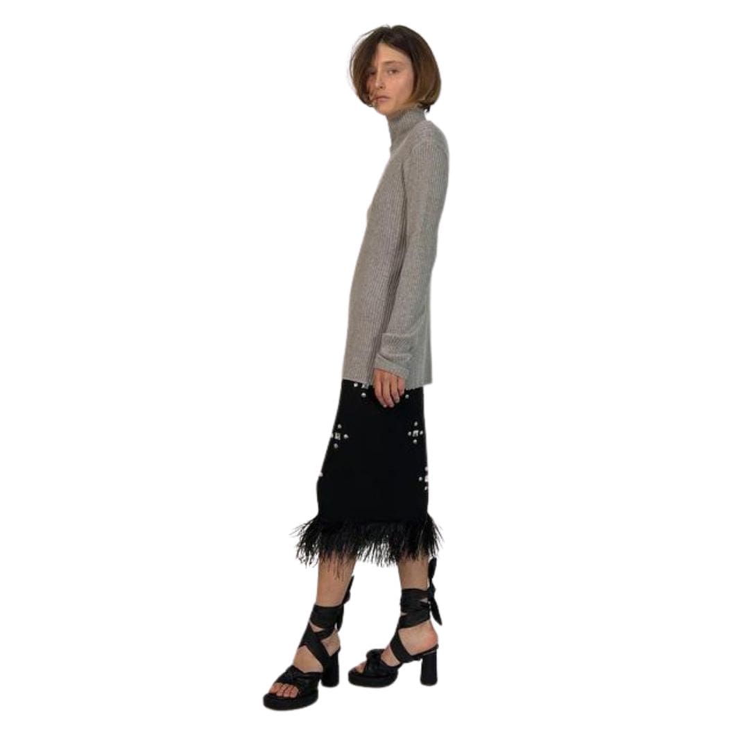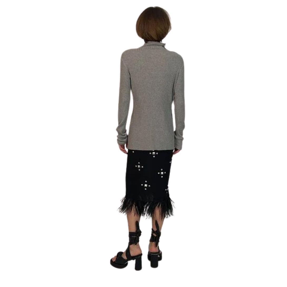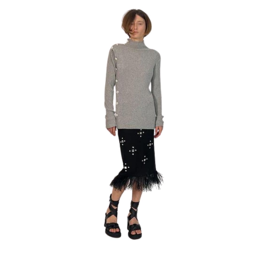 The Dodo Bar or Ozzy Shirt’ is crafted from ribbed knit and features long sleeves, a high neck, and an asymmetric overlap fastening secured by crystal embellished buttons.