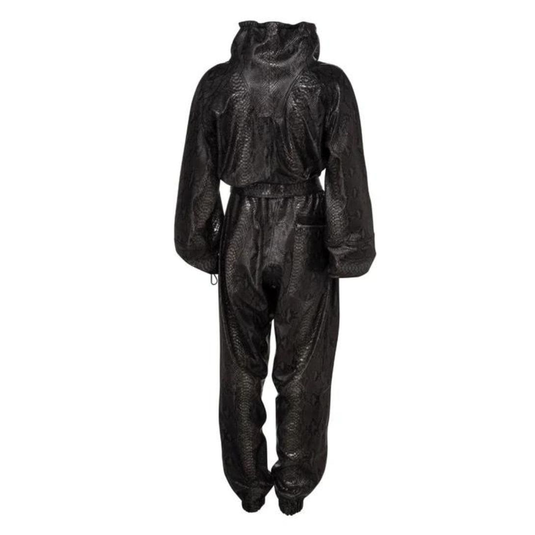 Dodo Bar or Piki B Jumpsuit is crafted from 100% leather, featuring an oversized fit with an exaggerated drawstring collar, drawstring details at the wrists, and cuffed ankles.