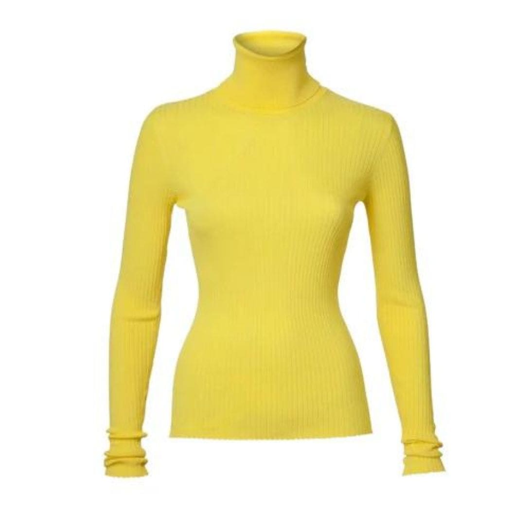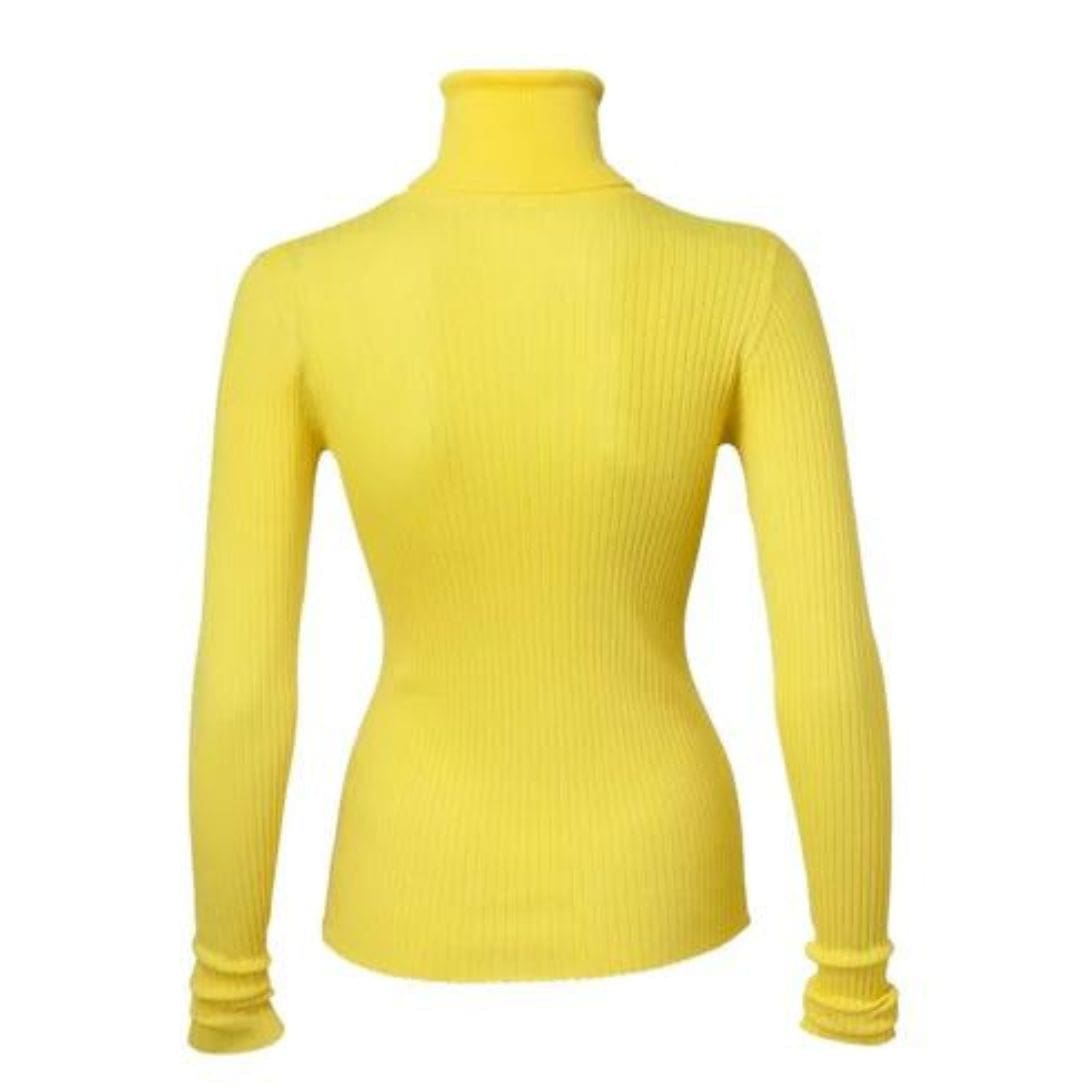 The Dodo Bar or Stacy Turtleneck  is crafted from a blend of 85% viscose and 15% nylon, featuring a tight fit with a turtleneck and ribbed detailing.