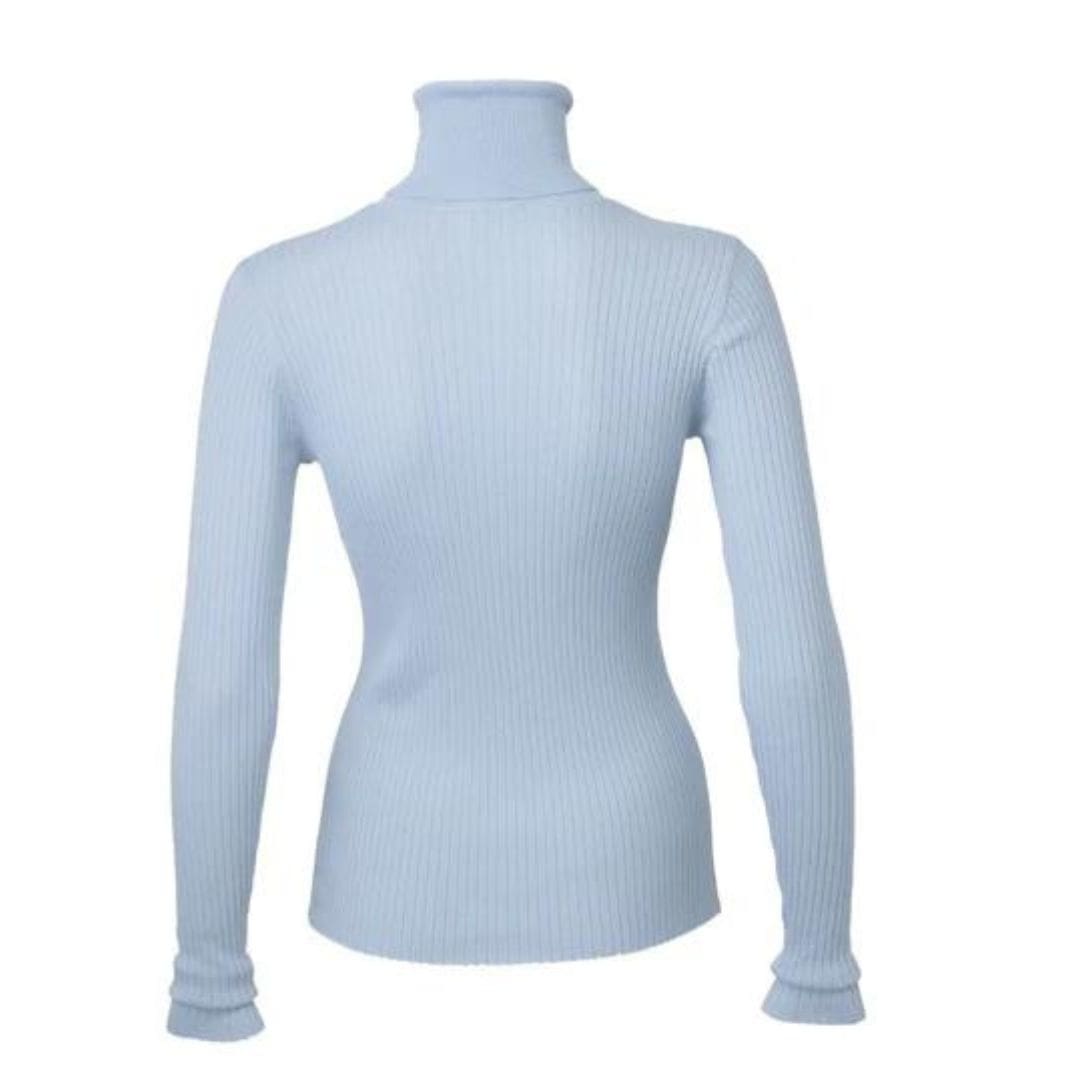The Dodo Bar or Stacy Turtleneck is crafted from a blend of 85% viscose and 15% nylon, featuring a tight fit with a turtleneck and ribbed detailing.