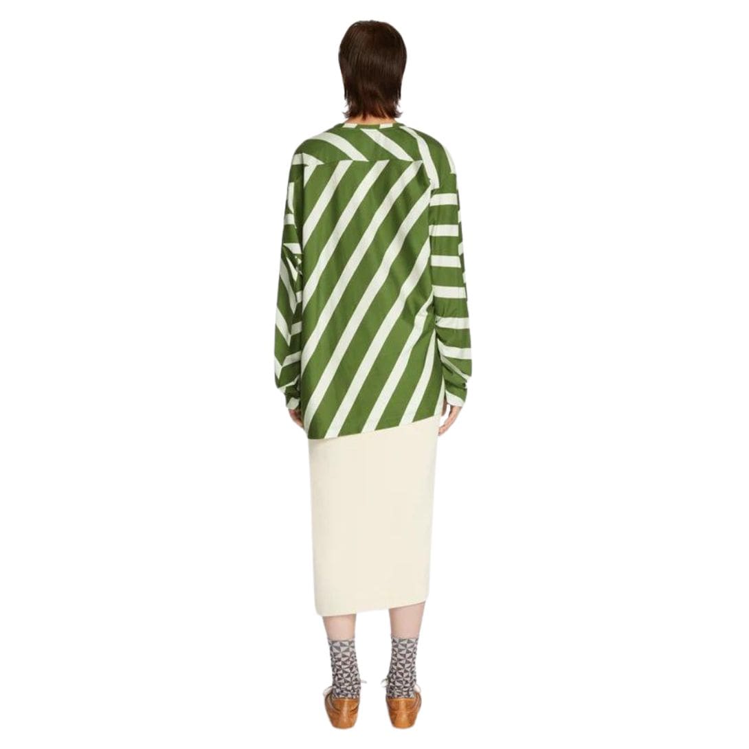 Dries Van Noten Asymmetrical Tee Green. is a stylish blend of comfort and contemporary design, crafted from 100% lightweight cotton. Featuring a striped pattern with contrast panels, a loose fit, an asymmetrical cut, long sleeves, and a crew neck, this tee requires special care to maintain its quality and distinctive appearance.