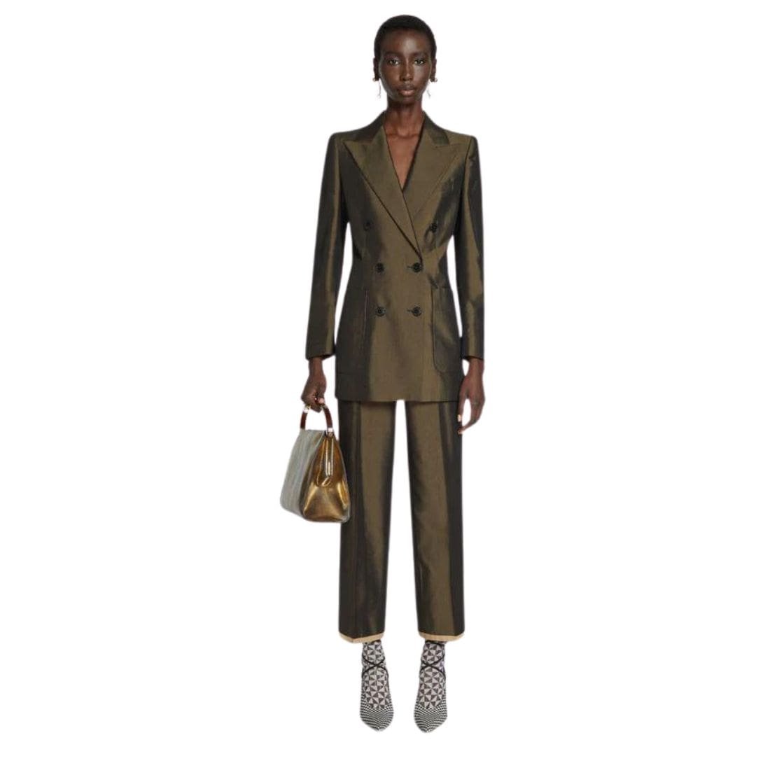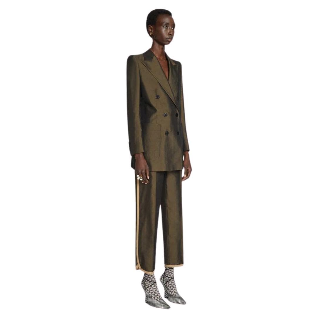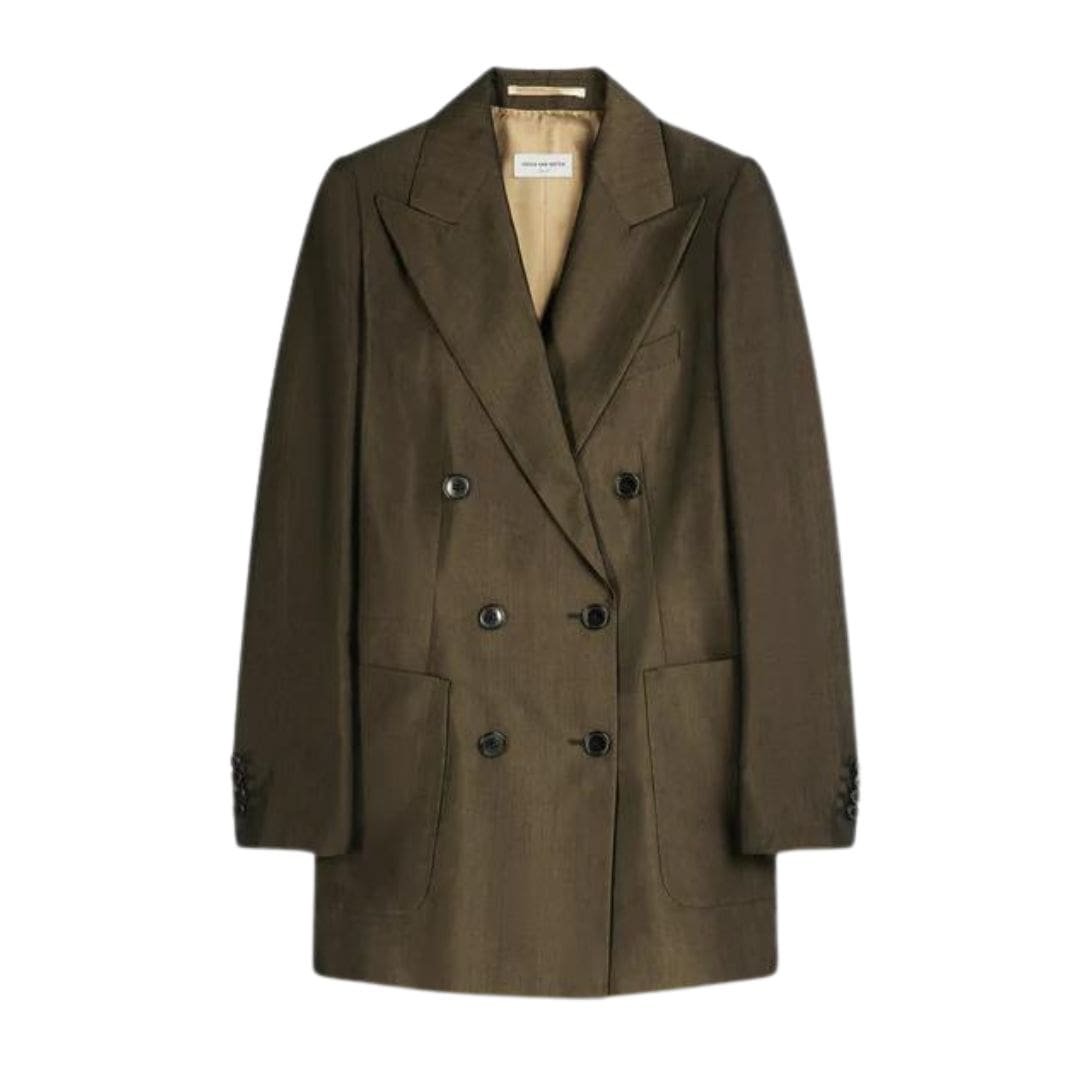Experience the timeless elegance and luxurious craftsmanship of the Dries Van Noten Double-Breasted Blazer in Bronze. Elevate your wardrobe with this exquisite piece and make a statement wherever you go.