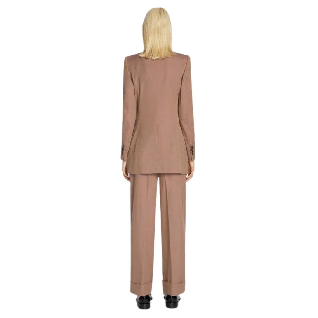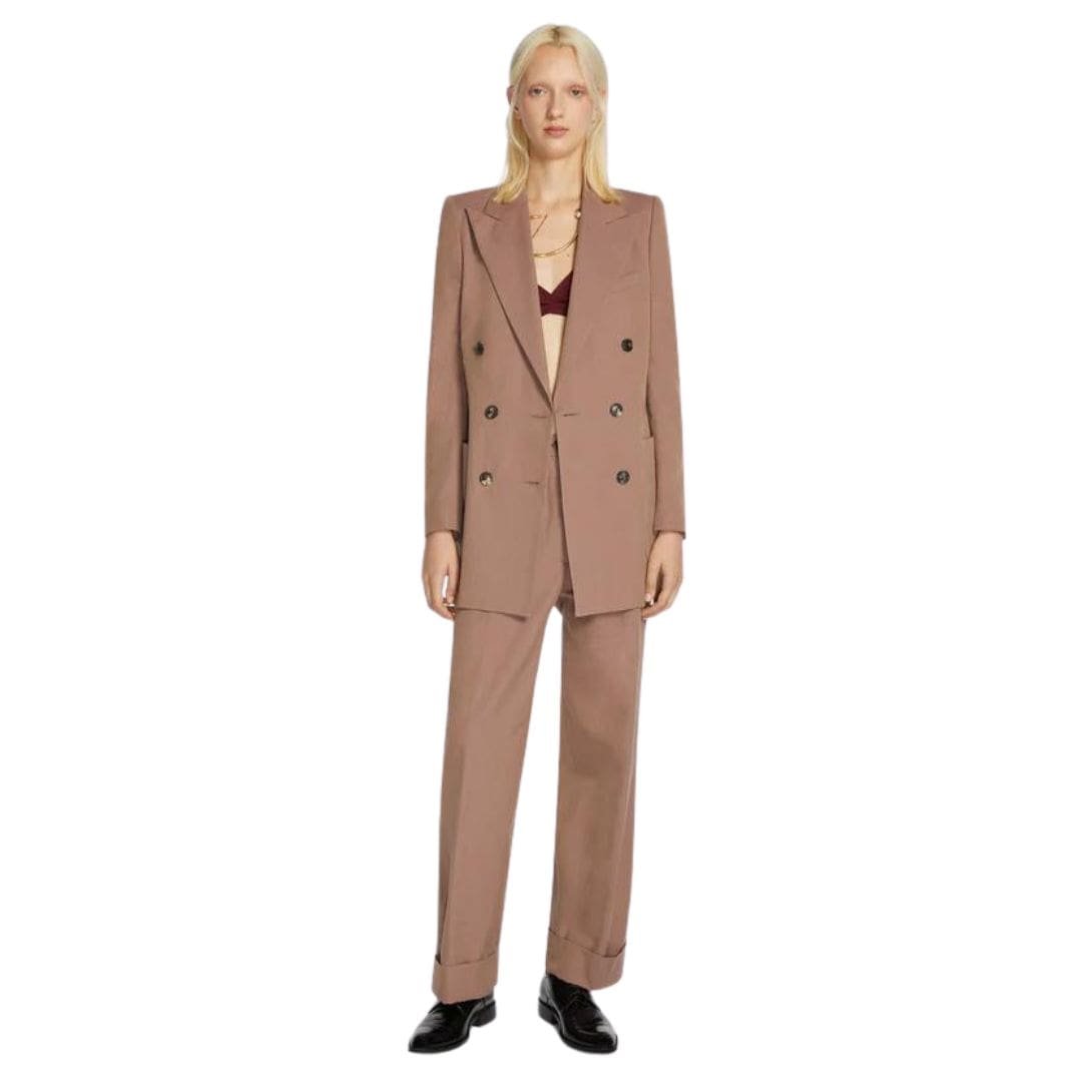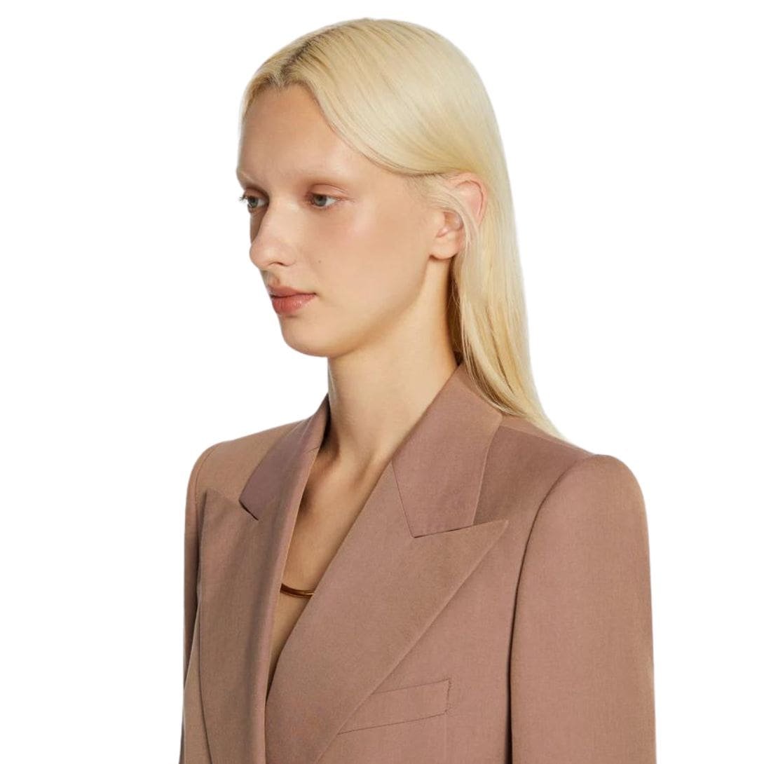 Designed with meticulous attention to detail, this blazer boasts a fitted silhouette that accentuates your figure with refinement. The pagoda shoulders add a hint of structure, enhancing the overall allure of the garment. Its double-breasted design exudes timeless charm, while front patch pockets and a welt pocket at the chest offer both style and functionality.