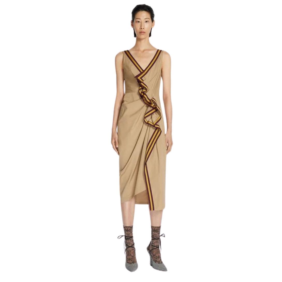 The DRIES VAN NOTEN DRAPED COTTON DRESS BEIGE epitomizes refined elegance and meticulous craftsmanship. Known for his ability to blend contemporary design with artisanal details, Dries Van Noten has created a piece that embodies both sophistication and individuality.