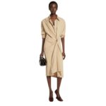 The draped silhouette of the dress creates a graceful and flowing appearance, enhanced by the lightweight nature of cotton gabardine. Known for its durability and smooth texture, cotton gabardine ensures comfort while maintaining a structured look that drapes beautifully on the body. Dries Van Noten’s choice of this premium fabric underscores its commitment to quality materials that provide both luxury and practicality.