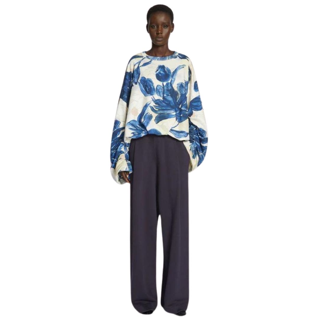 Crafted from 100% premium cotton, this sweatshirt offers comfort and durability. The hand-painted layered floral print adds a unique touch, making each piece one-of-a-kind. The oversized fit ensures a relaxed yet stylish look, while the tailored cut provides a refined silhouette. The pleated, gathered sleeves and crew neck design contribute to its distinct appeal.