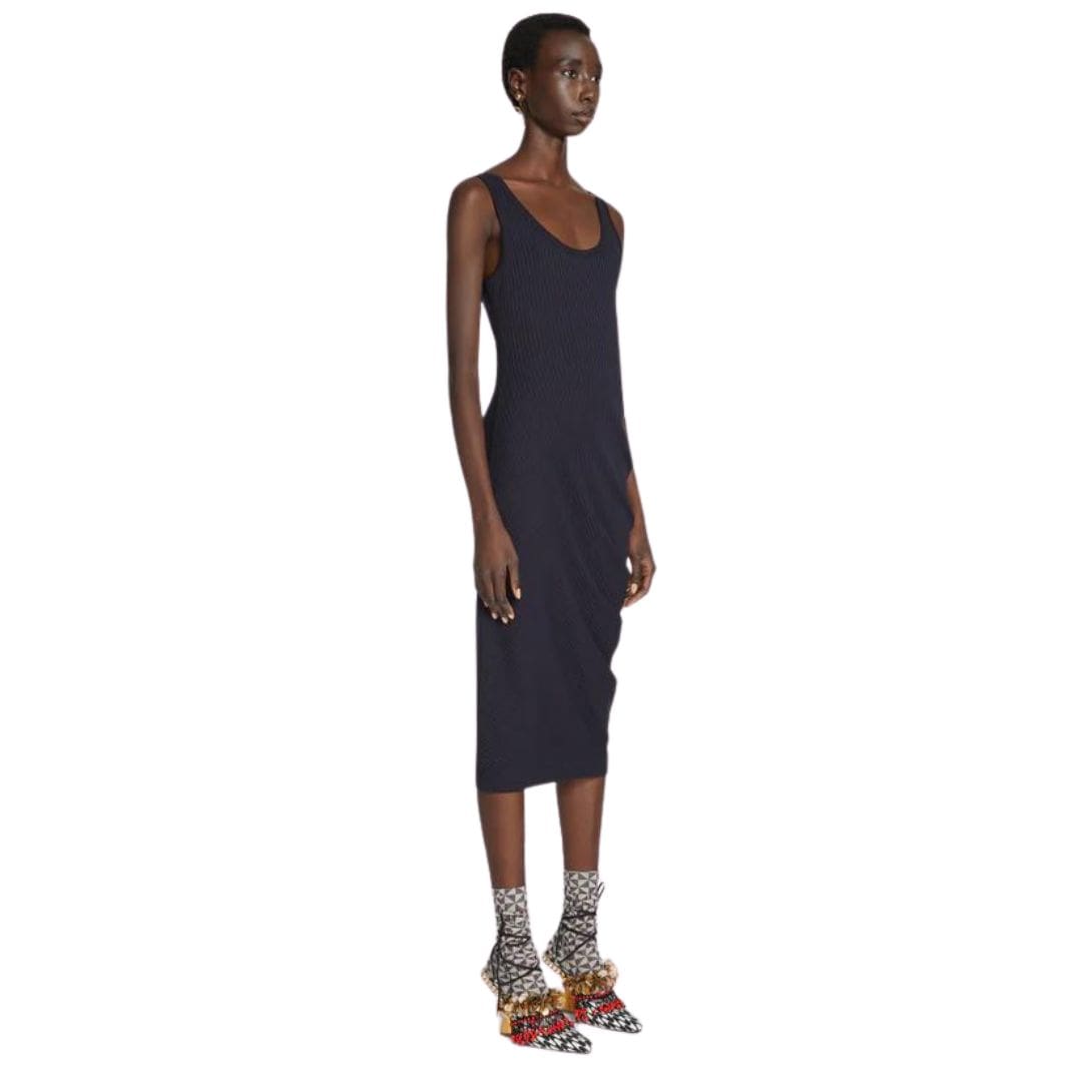 The dress features a tank top silhouette, characterized by its sleeveless design and scoop neckline, which enhances the shoulders and collarbones with flattering simplicity. Crafted from rib jersey fabric, known for its stretch and textured appearance, the dress offers a form-fitting yet comfortable wear that conforms to the body’s contours.