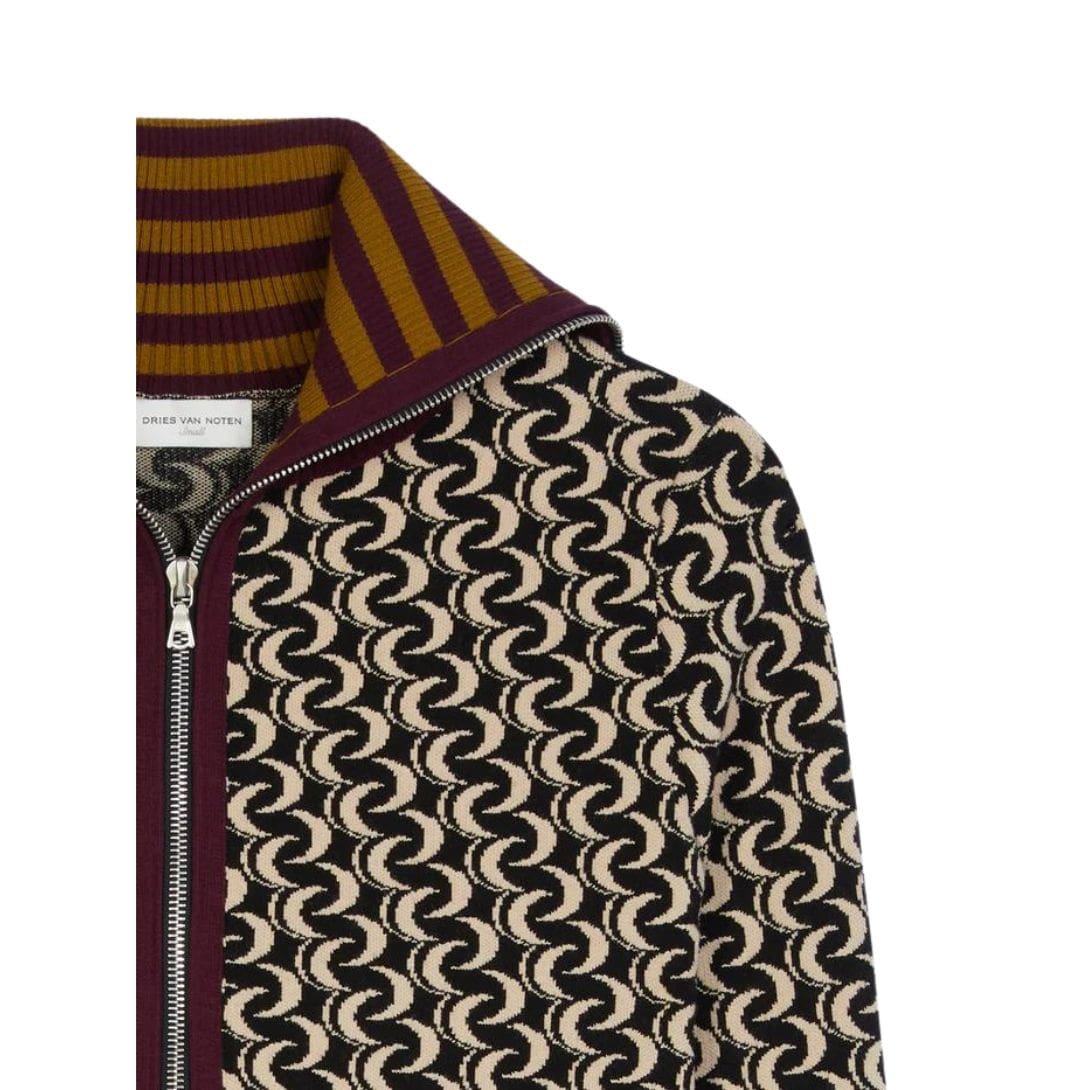Striped details on the cuffs, hem, and collar complement the jacquard motif, adding a refined and cohesive look to the cardigan. These striped accents enhance the cardigan’s aesthetic appeal and provide a stylish contrast to the abstract pattern.