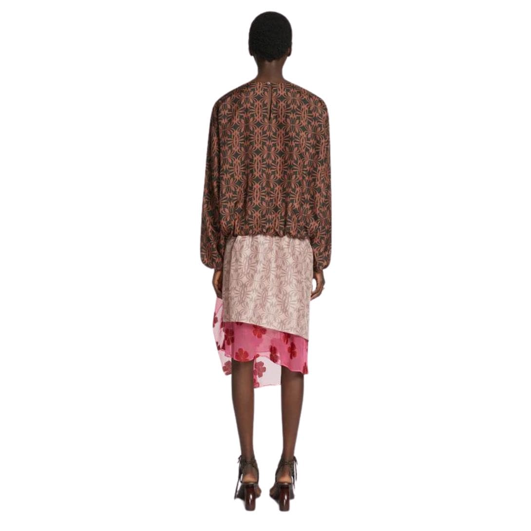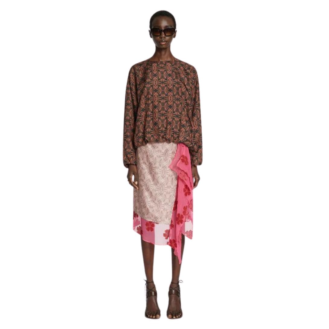The printed silk fabric features a captivating design that serves as the focal point of the garment. Whether adorned with vibrant florals, abstract patterns, or geometric motifs, each variation of the print enhances the top’s visual appeal and artistic allure. The intricate detailing and bold colours showcase Dries Van Noten’s expertise in creating prints that are both eye-catching and timeless.